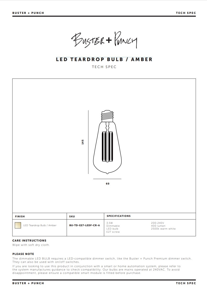 Die LED TEARDROP ist eine warmweiße LED-Lampe mit der klassischen Buster + Punch tropfenförmigen Glasform mit Bernsteintönung.