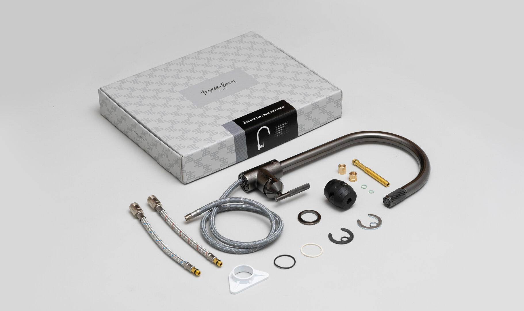 Dieser Artikel betrifft eine Küchenarmatur mit Griffmischbatterie in Gun-Metal mit herausziehbarer Brause. Der ausziehbare Brausekopf und Griff sind linear geschliffen, was charakteristisch für Buster+Punch ist. Diese Armatur wird in Italien aus massivem Edelstahl gegossen, sandgestrahlt und gefräst. Das charakteristische längliche Zackenmuster wird dann von Hand sehr fein verarbeitet.