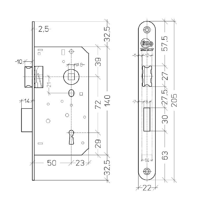 Einsteckschloss von Litto für Innentüren mit abgerundeter Gegenplatte von 205x22mm.