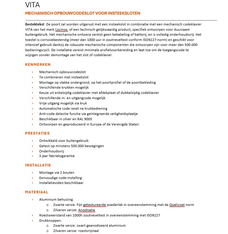 Dieses silberfarbene „VITA“ ist ein einfaches und wartungsfreies mechanisches Codeschloss, das speziell für Tore mit Einsteckschloss entwickelt wurde. Das System funktioniert komplett ohne Strom und ist mit den Einsteckschlössern FORTYLOCK, FIFTYLOCK, SIXTYLOCK und EIGHTYLOCK kompatibel.
