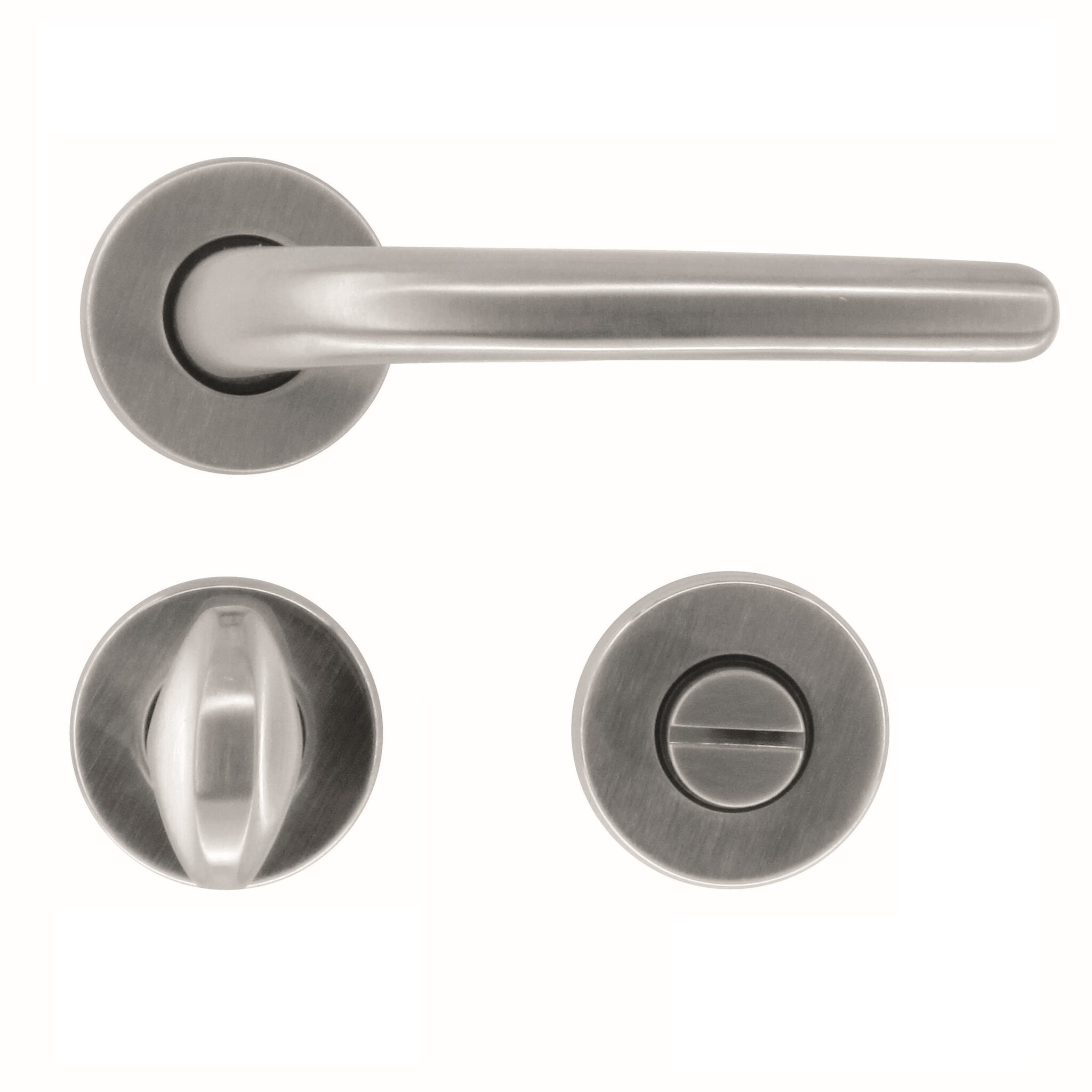 Diese massiven Türgriffe aus Edelstahl stehen auf einer runden Rosette und haben eine klassische Optik.