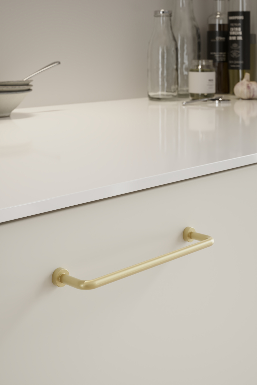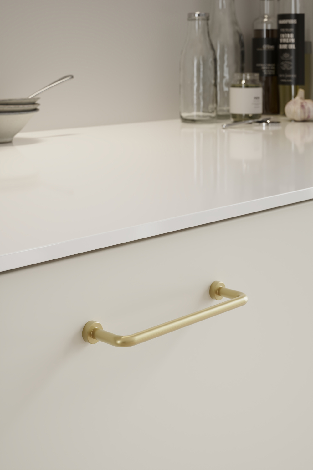 Dieser Möbelgriff besteht aus bleifreiem Messing, das am Ende gebürstet ist, um ein mattes Aussehen zu erzielen.
