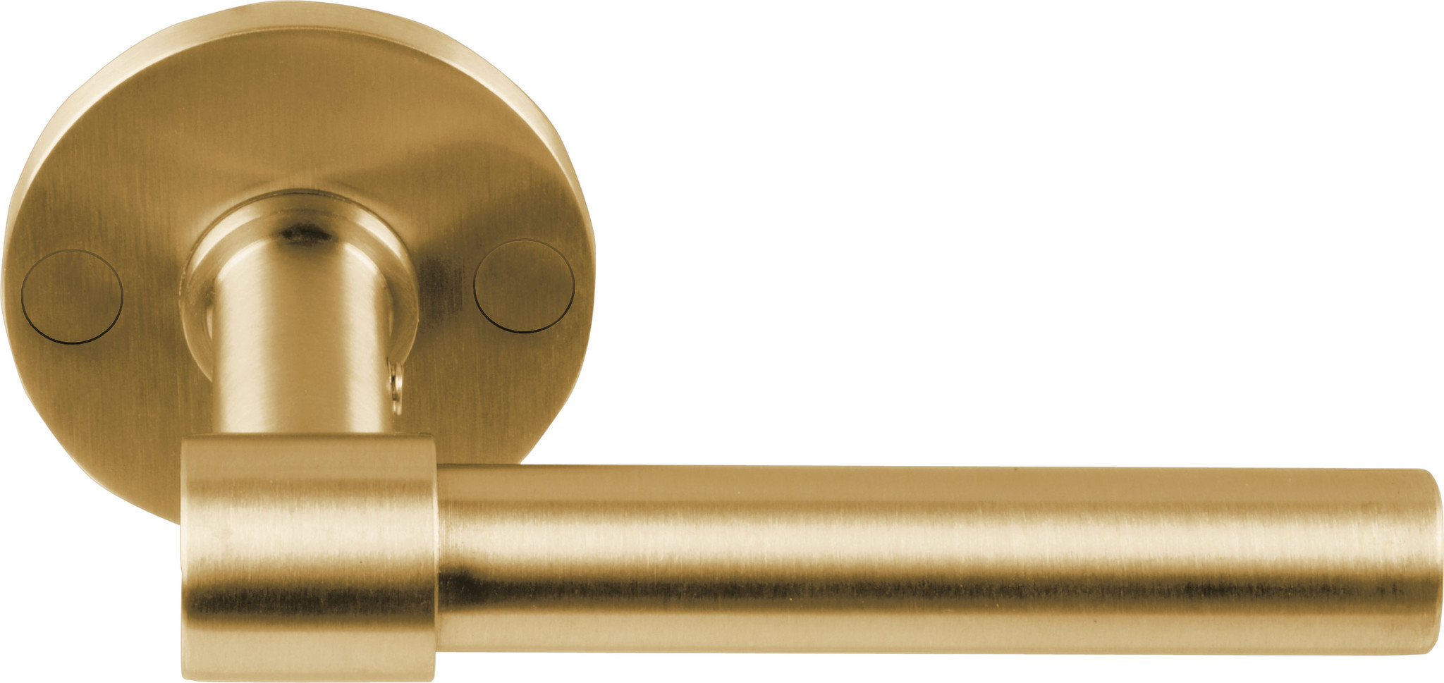Diese goldfarbenen Türdrücker sind auf gefederten Rundrosetten mit einem Durchmesser von 50 mm und einer Dicke von nur 5 mm montiert. Die Türgriffe sind auch in anderen Ausführungen erhältlich.