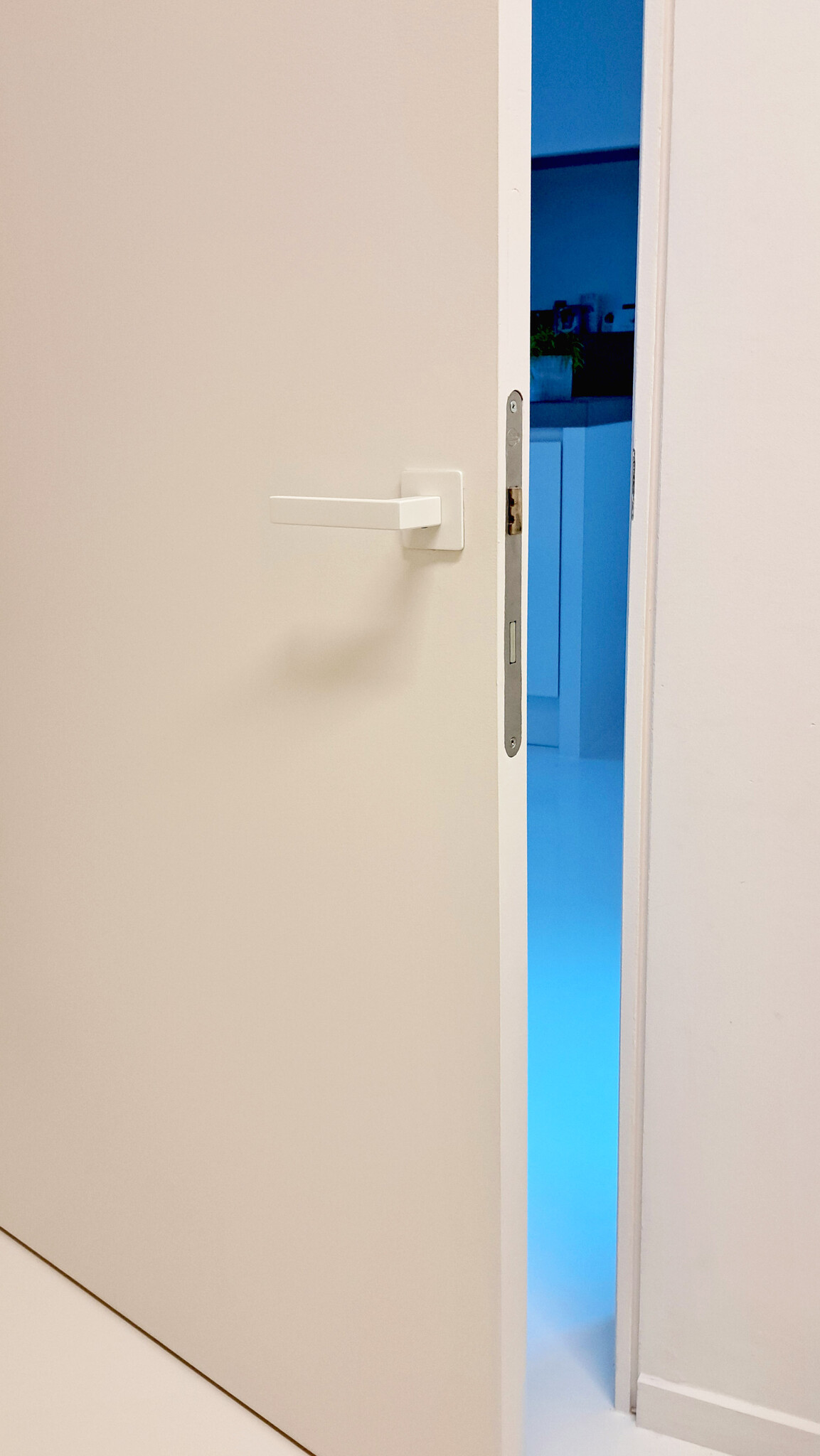 Die weißen Türgriffe, passend für Innentüren bis 43 mm, werden paarweise geliefert und sind mit dem STERK-Logo versehen.