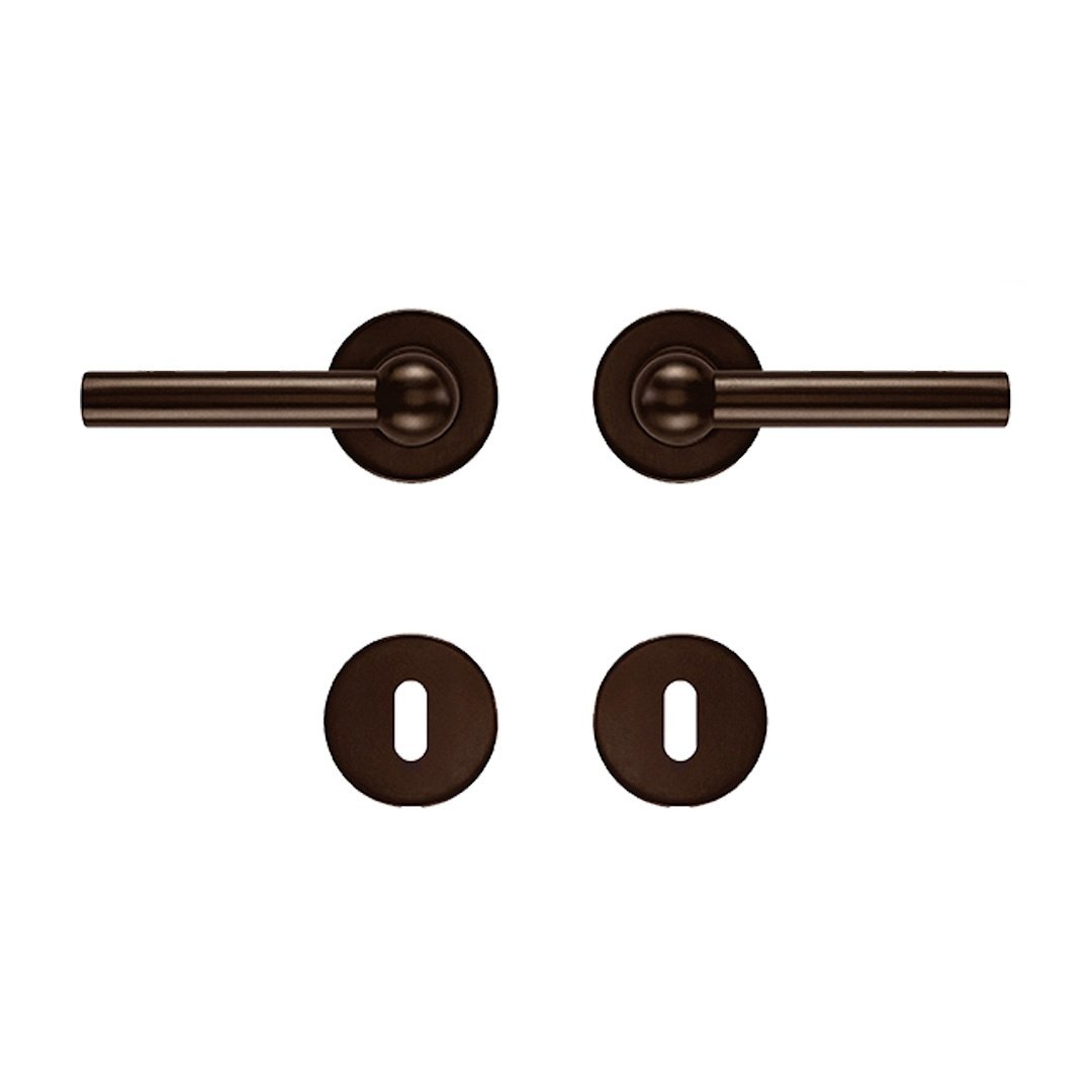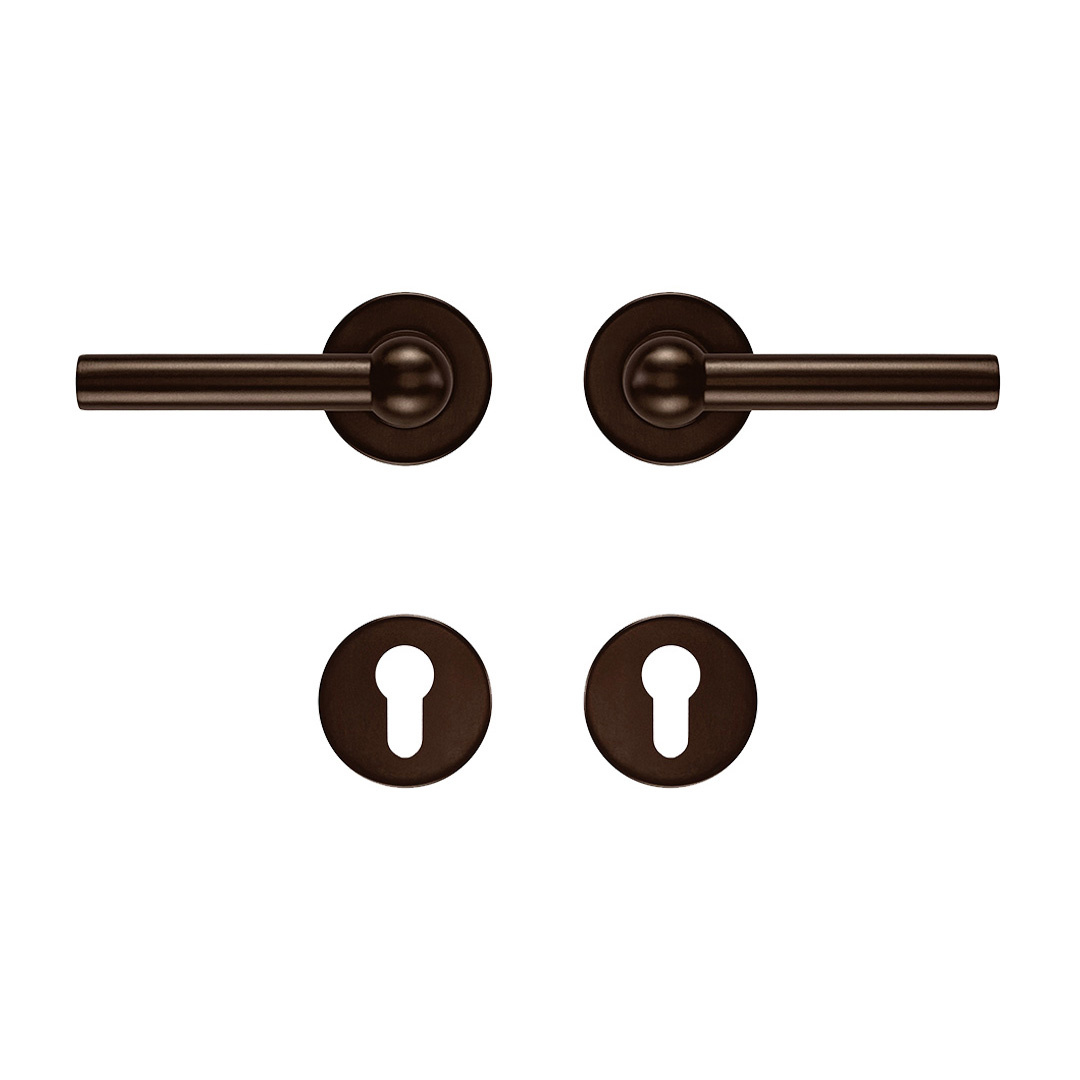 Beschreibung Paar mattbronzene RAILY-Türgriffe auf runden Rosetten, geeignet für Innentüren