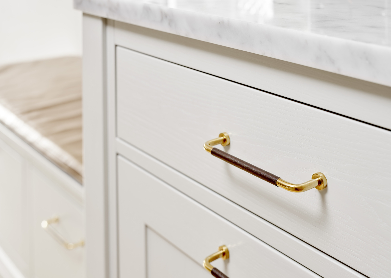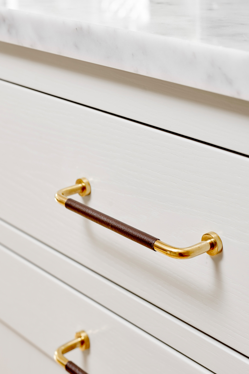 Möbelgriff LOUNGE von Furnipart aus glänzendem Messing und mit braunem Leder veredelt