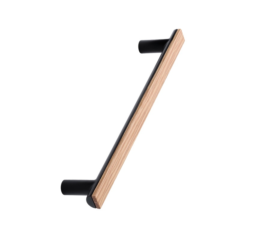 Dieser schwarz-braune Möbelgriff besteht aus heller Eiche in Kombination mit einem mattschwarzen Zamak-Rahmen.