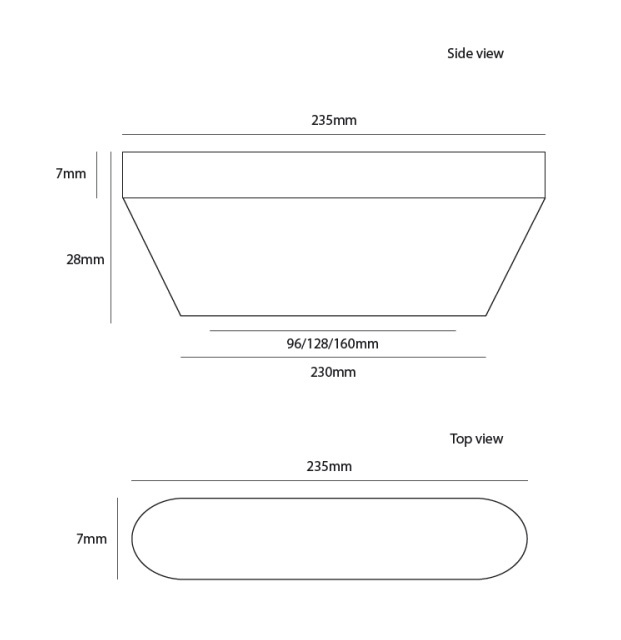 Der ovale Griff mit einer Länge von 235 mm und einer Breite von 7 mm wird per Stück inklusive Befestigungsschrauben M4 geliefert. Der Griff ist mit 6 Befestigungslöchern versehen, wodurch es möglich ist, ihn mit einem Achsabstand von 96 mm, 128 mm oder 160 mm zu befestigen.