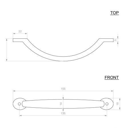 Dieser Möbelgriff hat eine Gesamtlänge von 155 mm und der Achsabstand der Befestigungslöcher beträgt 135 mm.