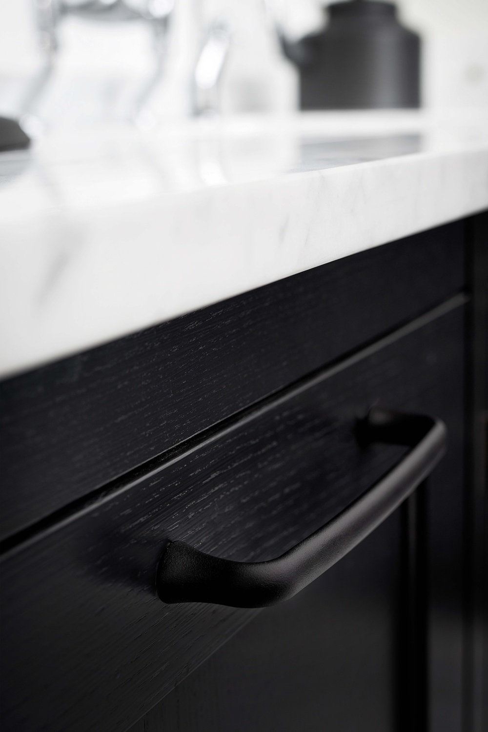 Dieser Möbelgriff aus Gusseisen ist mit einer mattschwarzen Beschichtung versehen. Dabei handelt es sich nicht um eine glatte Oberfläche, sondern um eine Oberfläche mit etwas Struktur.
