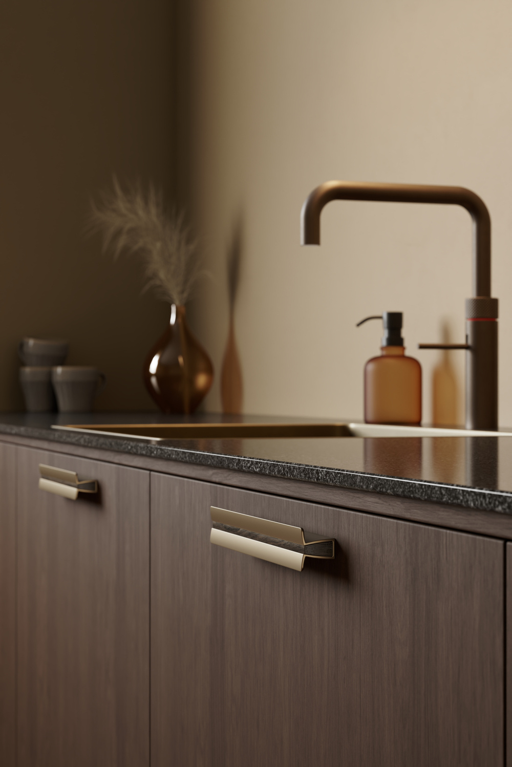 Schöne moderne Möbelgriffe von Furnipart, die Holz mit mattem Messing kombinieren