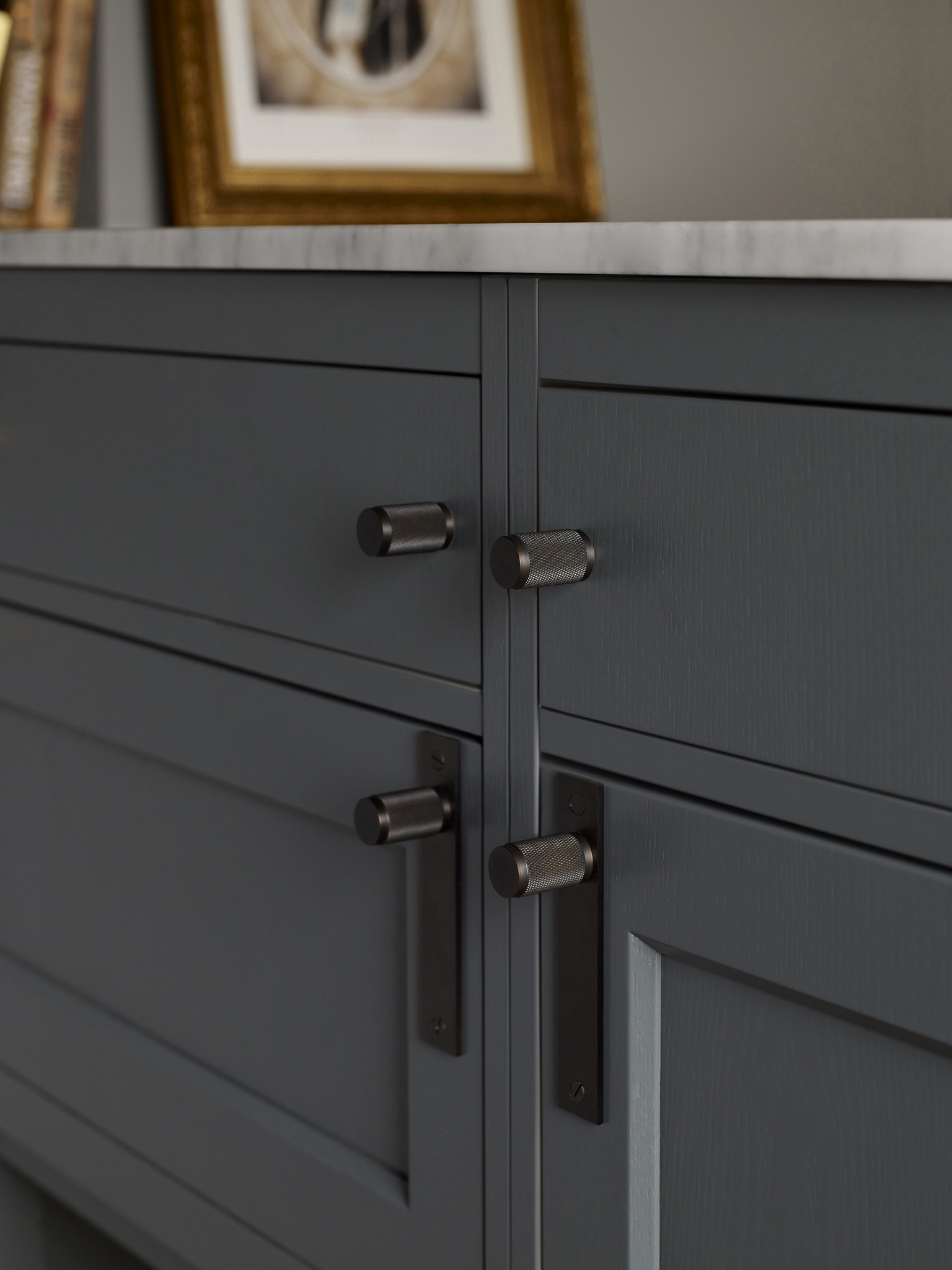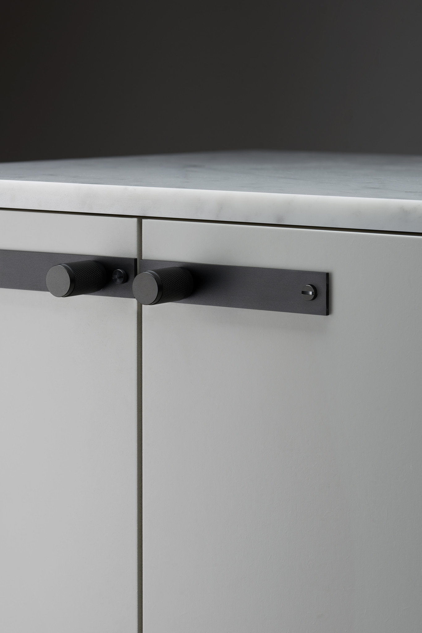 Sie stehen auf massiven 130x23mm Rückenplatten. Die Möbelknöpfe selbst haben einen Durchmesser von 20 mm und sind mit dem für Buster+Punch charakteristischen Kreuz-Diamantschliff-Motiv versehen.