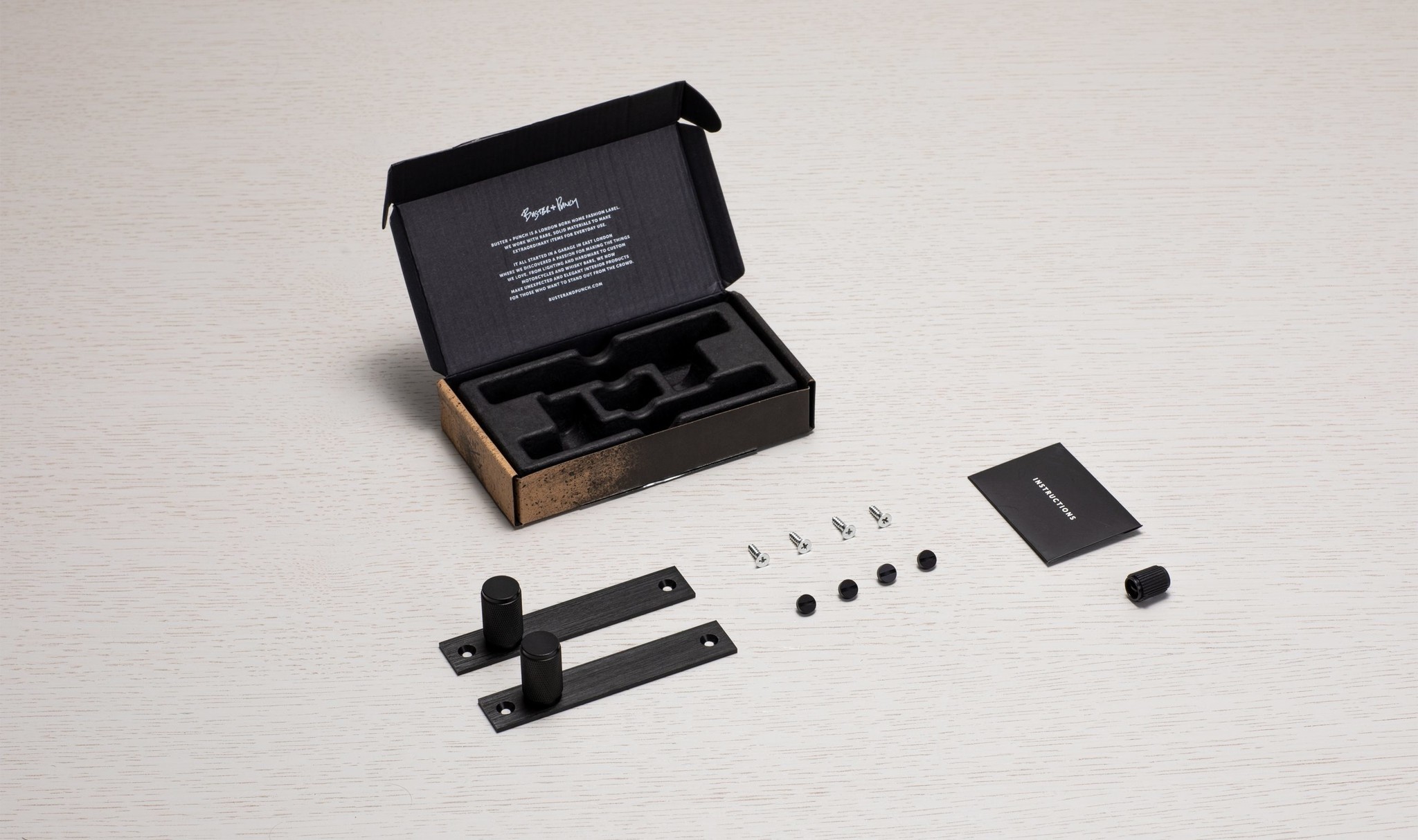 Paar Buster + Punch Möbelknöpfe auf schwarzen Rückplatten