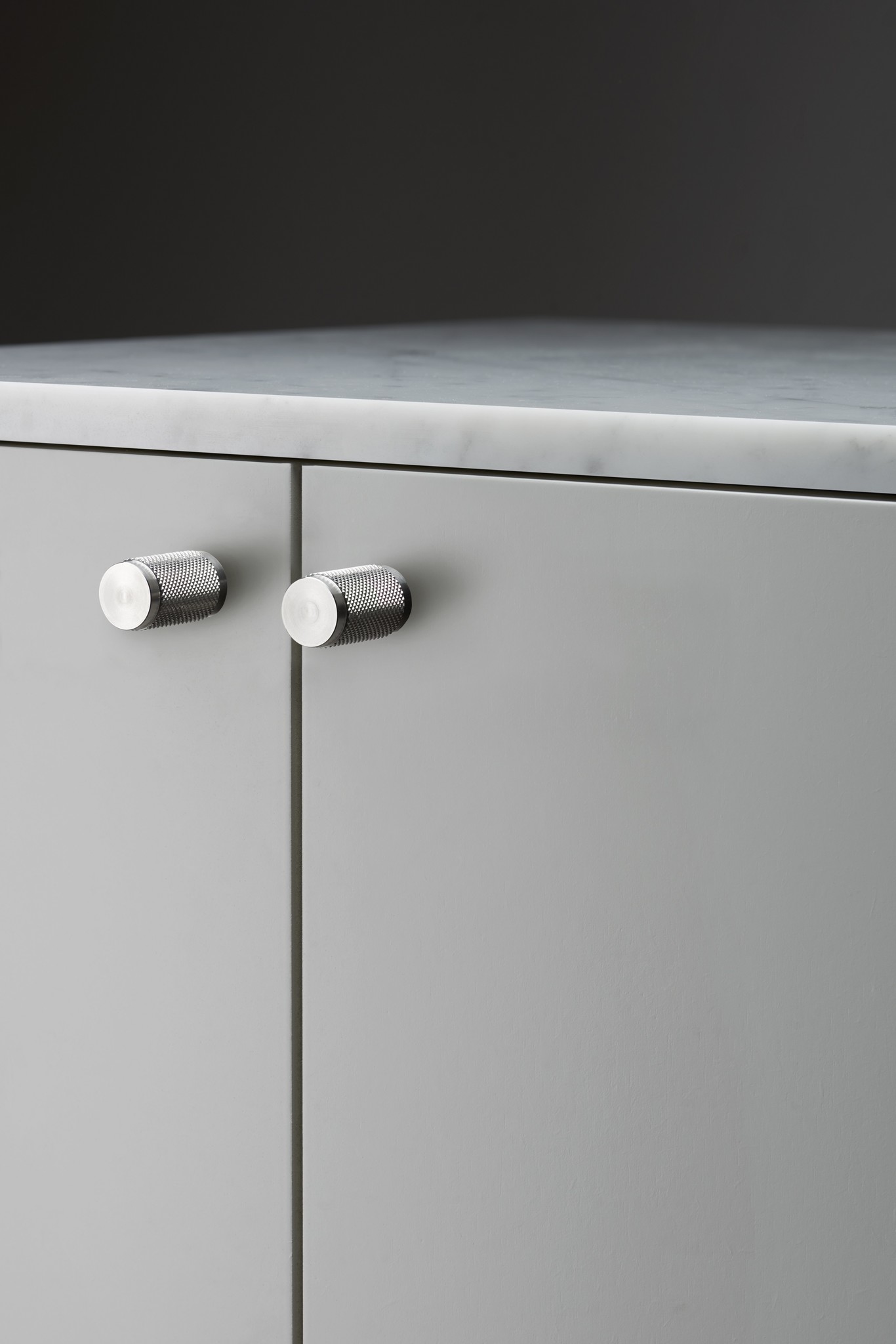 Ein Paar Möbelknöpfe aus massivem Edelstahl mit dem charakteristischen diamantgeschliffenen, kreuzförmigen Muster von Buster&Punch.