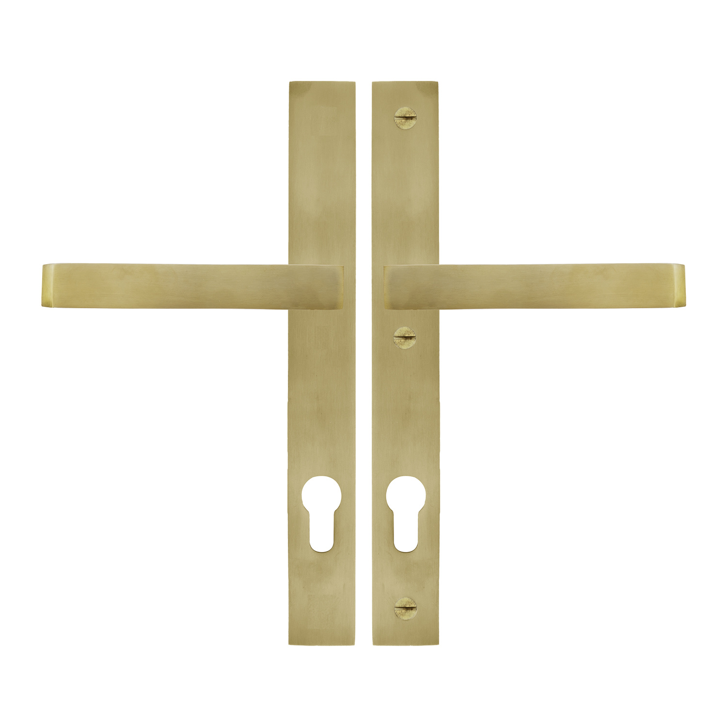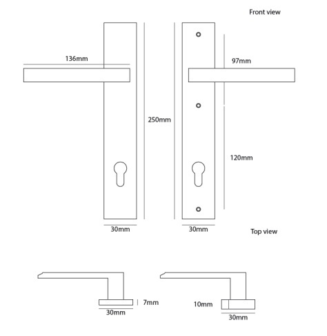 Das Paar sehr schlanker Türgriffe steht auf einem geraden Schild von 30 x 250 mm, das außen 7 mm und innen 10 mm dick ist. Drei Punkte sind für die durchgehende Befestigung vorgesehen.