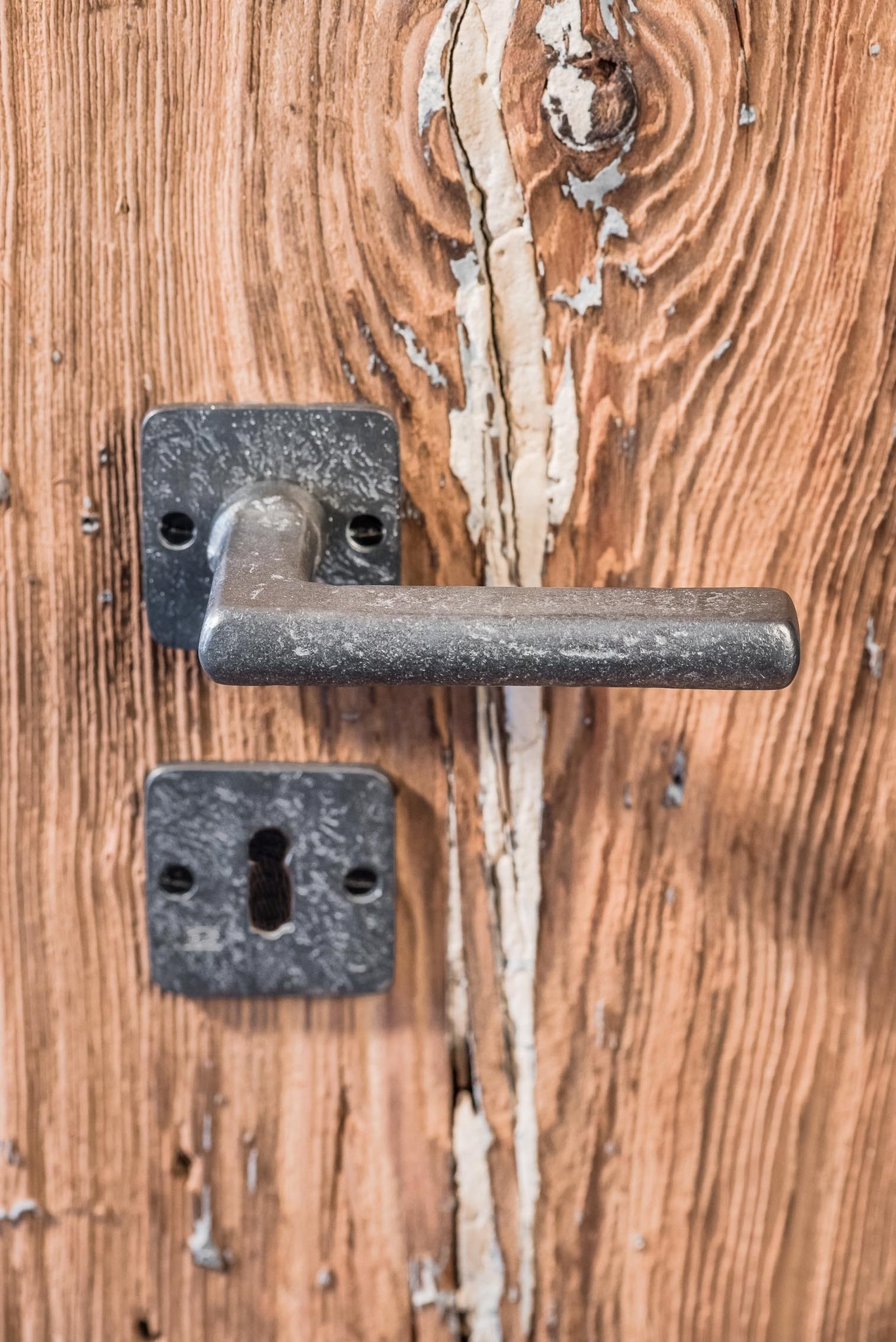 Diese Türgriffe aus Rohmetall stammen aus der Pure-Kollektion von Dauby und sind auf einer 50 mm großen quadratischen Rosette montiert.