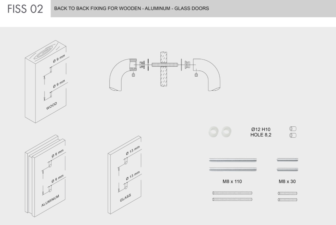 Mit dem mitgelieferten Montagematerial können Sie die Türgriffe paarweise an Glas-, Aluminium- und Holztüren montieren.