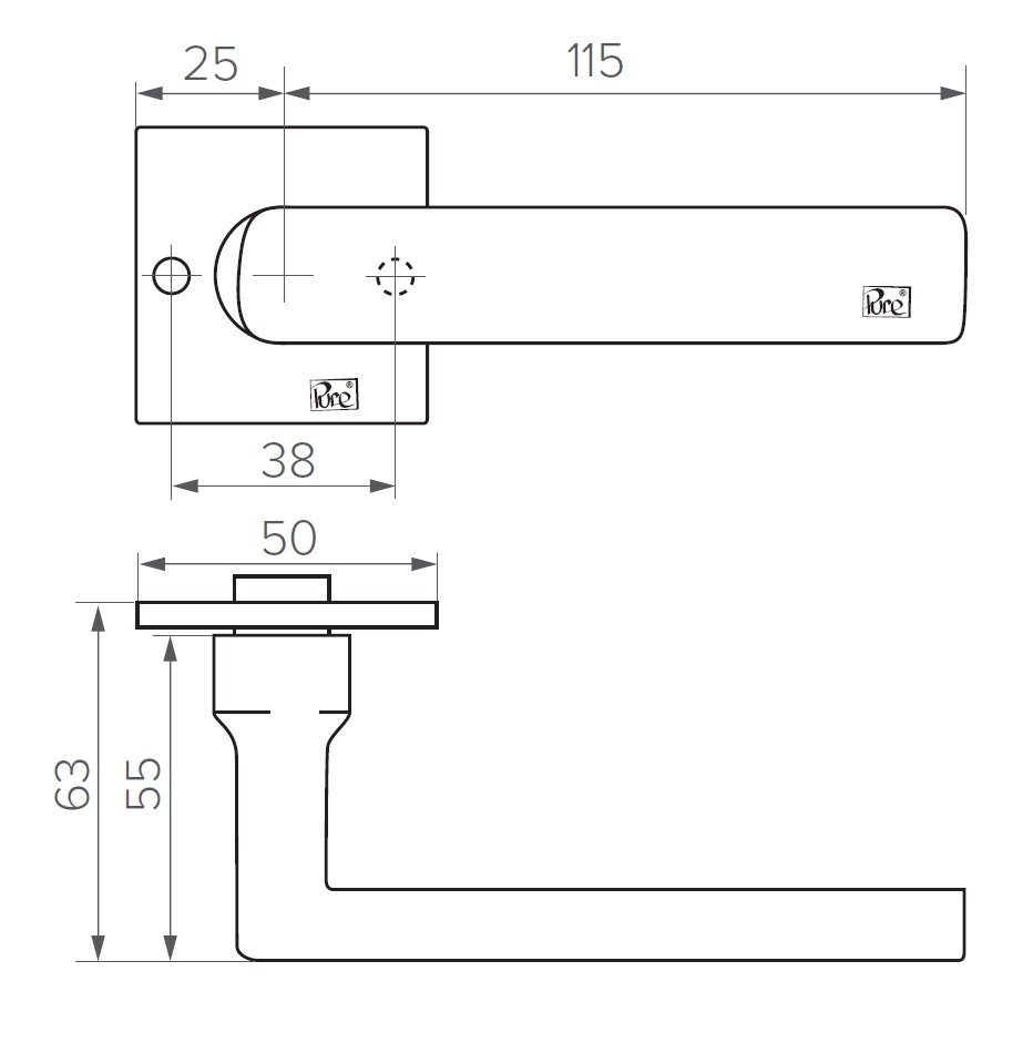 Diese Türgriffe aus Rohmetall gehören zur „ Pure“ -Kollektion von Dauby und sind auf einer 50 x 50 mm großen quadratischen Rosette montiert. Die Befestigungspunkte haben einen Abstand von 38 mm.