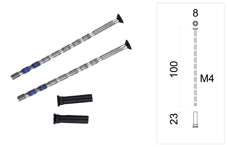 Die Schraube hat eine Länge von 100 mm und die Hülse mit dem innenliegenden Schraubengewinde hat eine Länge von 23 mm.