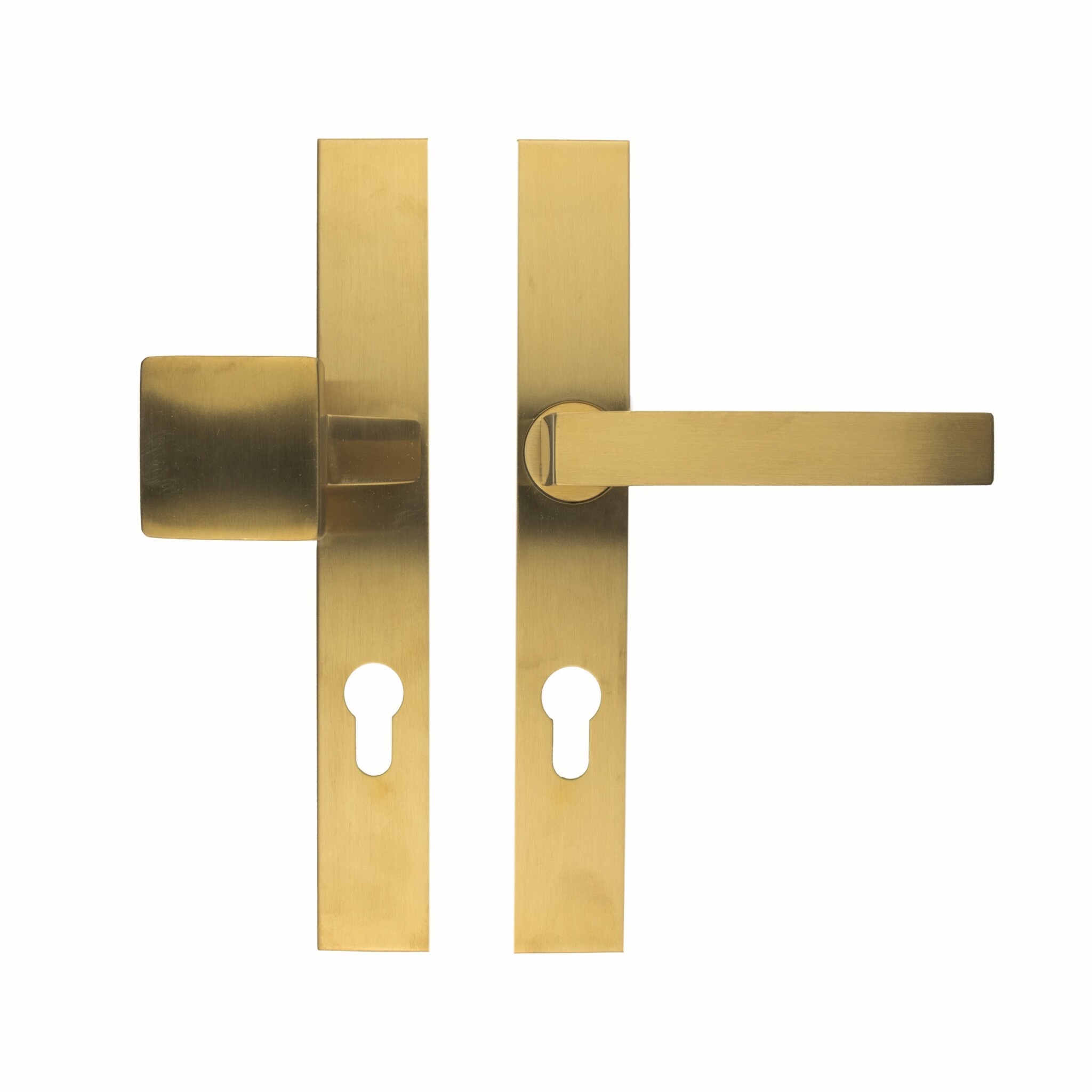 Sicherheitsset auf geradem Schild mit Griff und Knauf in Mattgold, auch für den Außenbereich