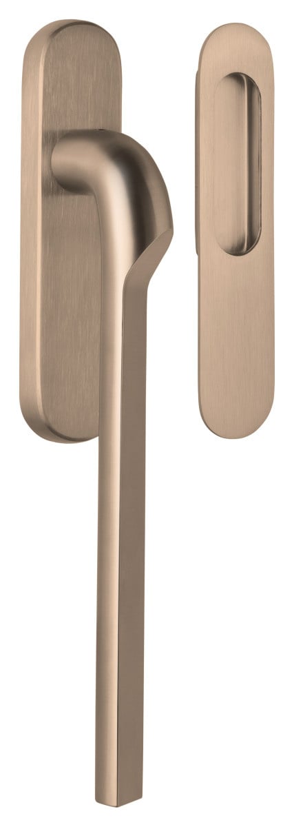 Der hellbronzefarbene Hebe-/Schiebegriff ist aus Edelstahl gefertigt und am Ende mit einer robusten, hellbronzefarbenen PVD-Beschichtung versehen.
