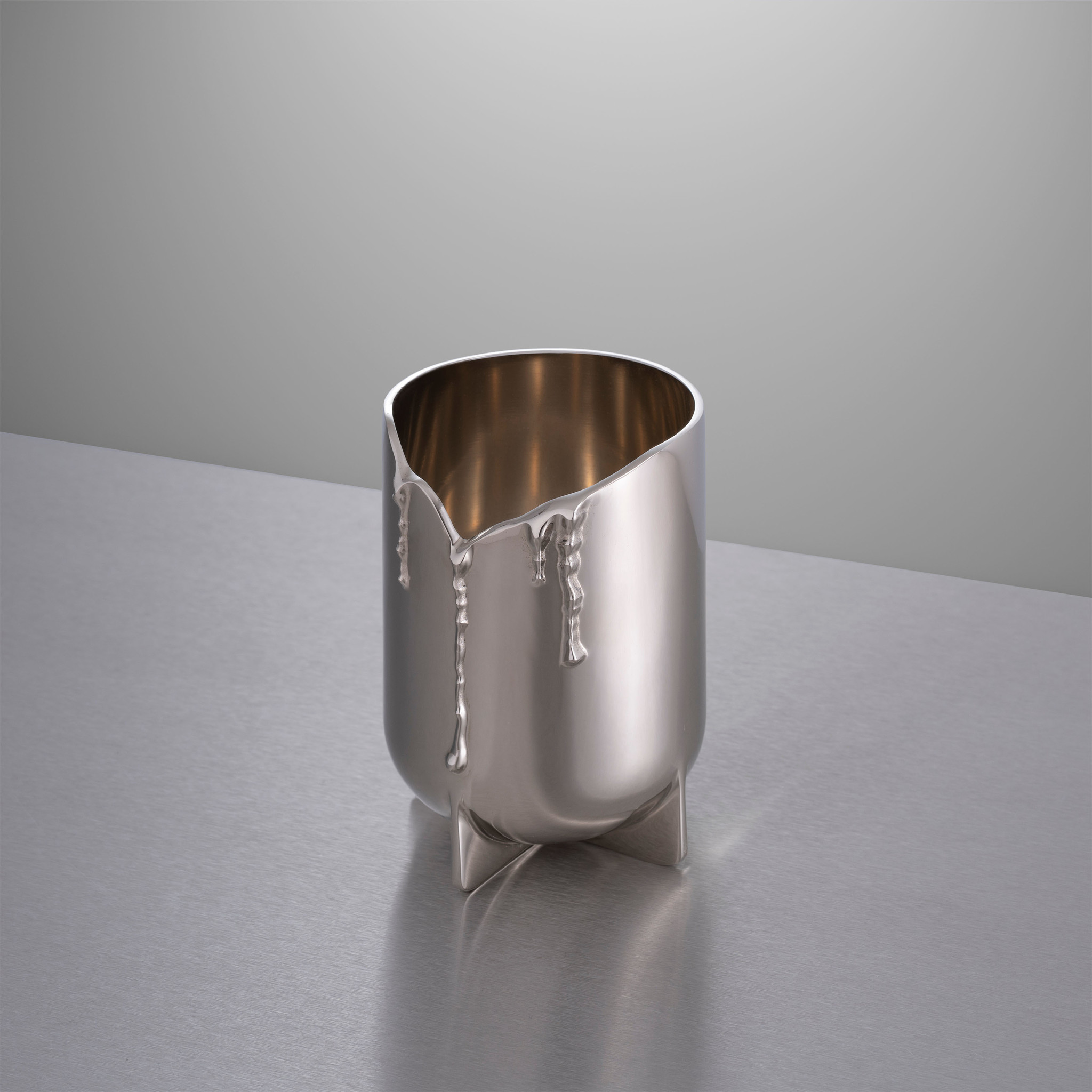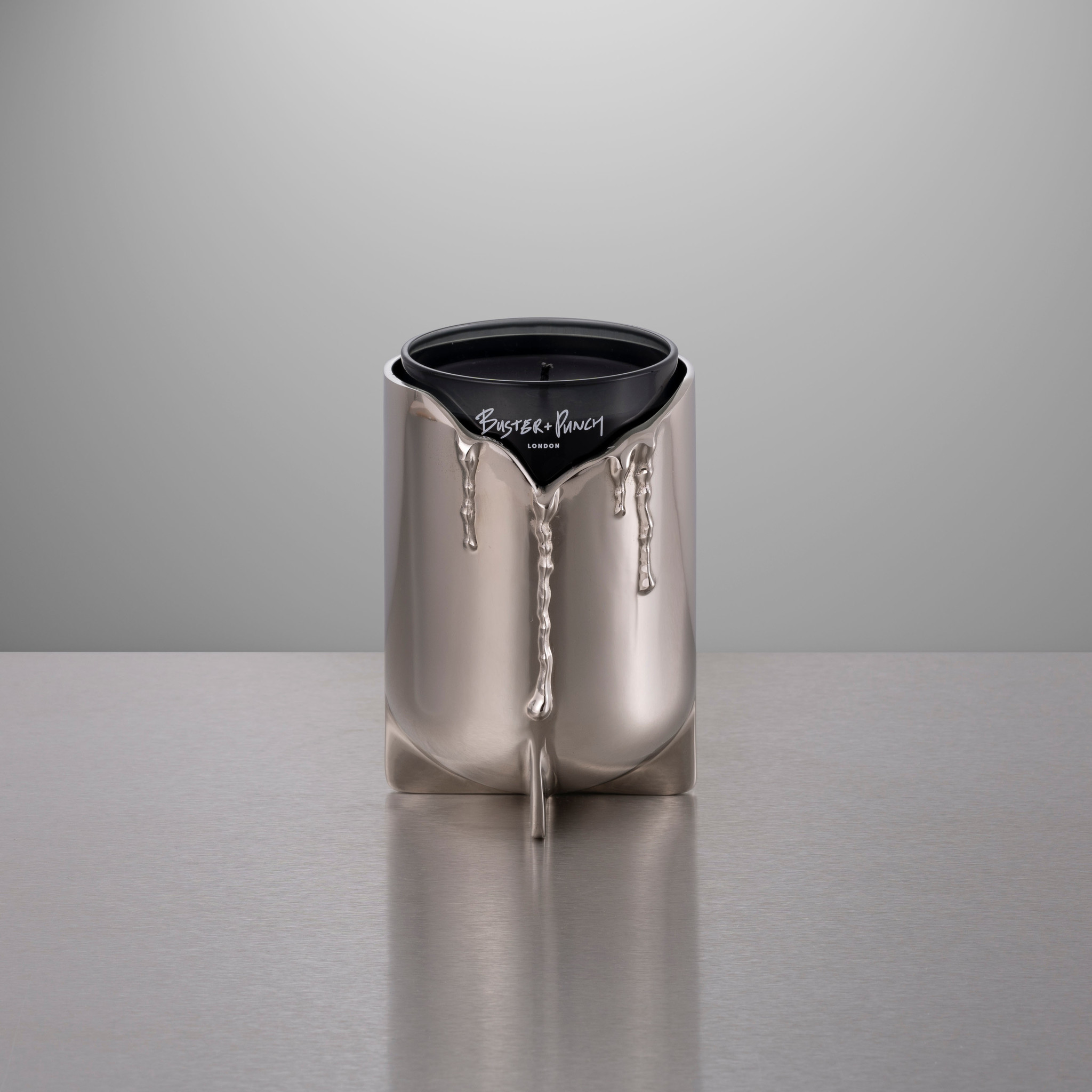 Luxuriöser Kerzenhalter aus massivem Metall, handpoliert, mit Details aus schmelzendem Wachs. Entworfen für eine 220 g Buster + Punch Duftkerze.