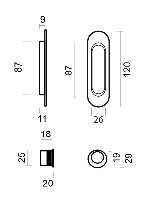 2 Stück: Außen 120 x 29 mm und innen 87 x 26 mm mit einer Tiefe von 9 mm.