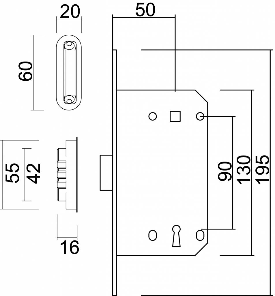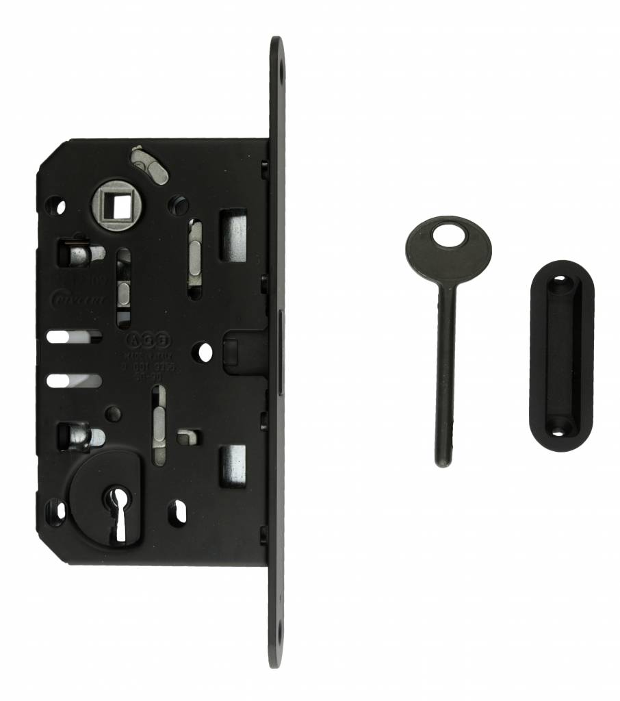 Schwarzes Magnetschloss mit 90-mm-Achse und 50-mm-Spritzschutz. Die Frontplatte misst 22 x 195 mm.