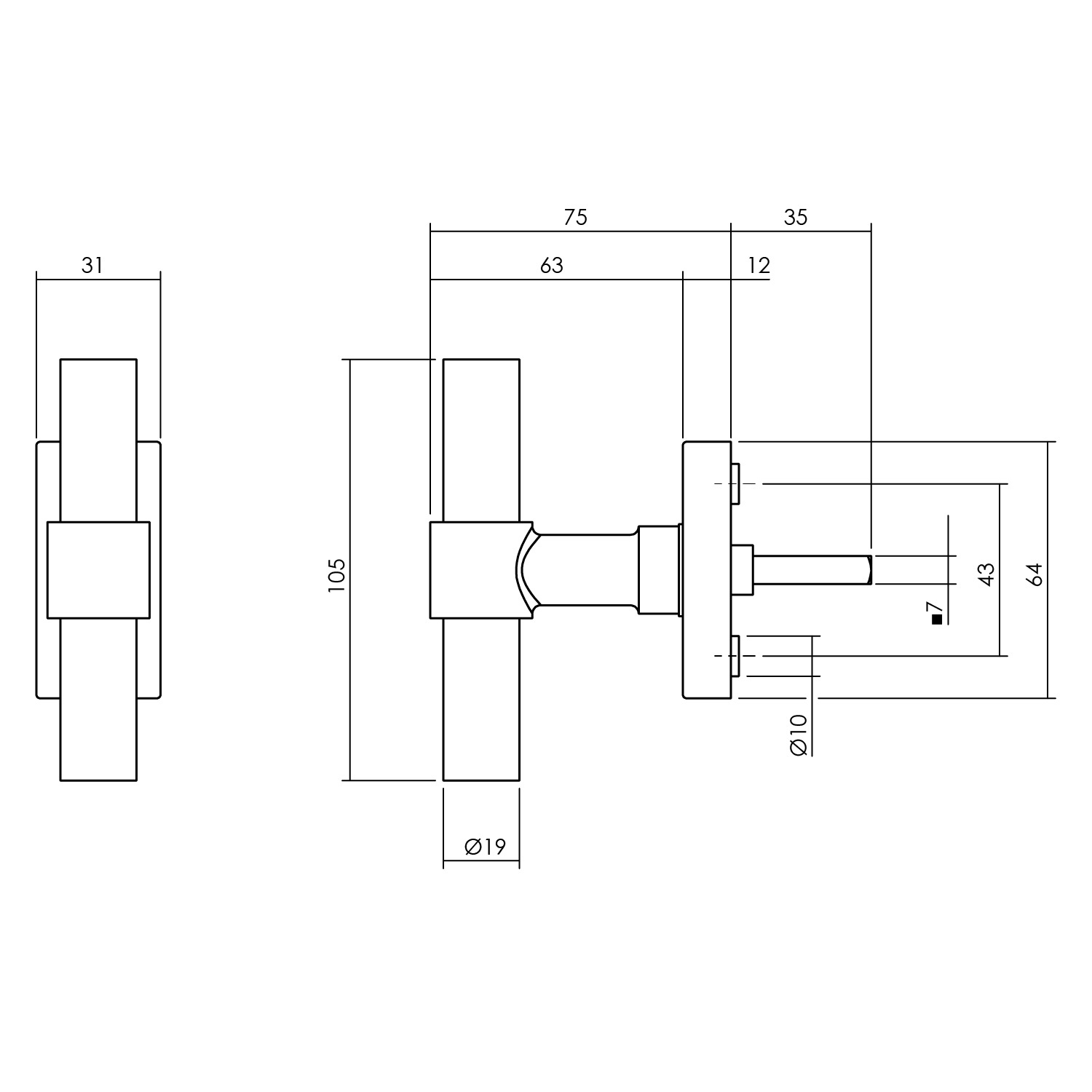 Der runde T-förmige Griff mit einem Ø von 19 mm hat eine Verdickung am Knoten und steht auf einer rechteckigen Rosette von 64 x 31 mm, die 12 mm übersteht. Die Befestigungslöcher haben einen Abstand von 43 mm.