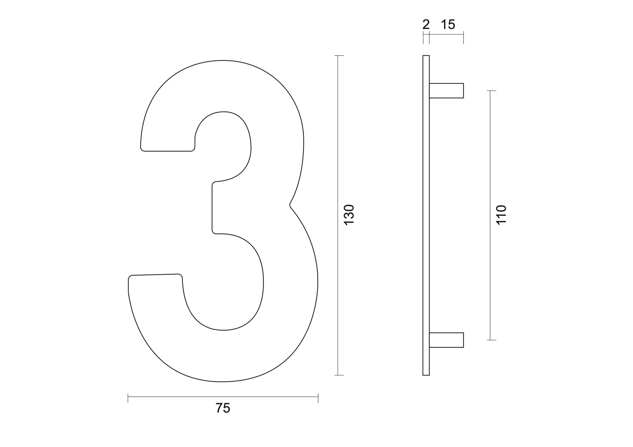 Diese schwarze Hausnummer „3“ ist für die Wandmontage geeignet, hat eine Höhe von 130 mm und eine Dicke von 2 mm.