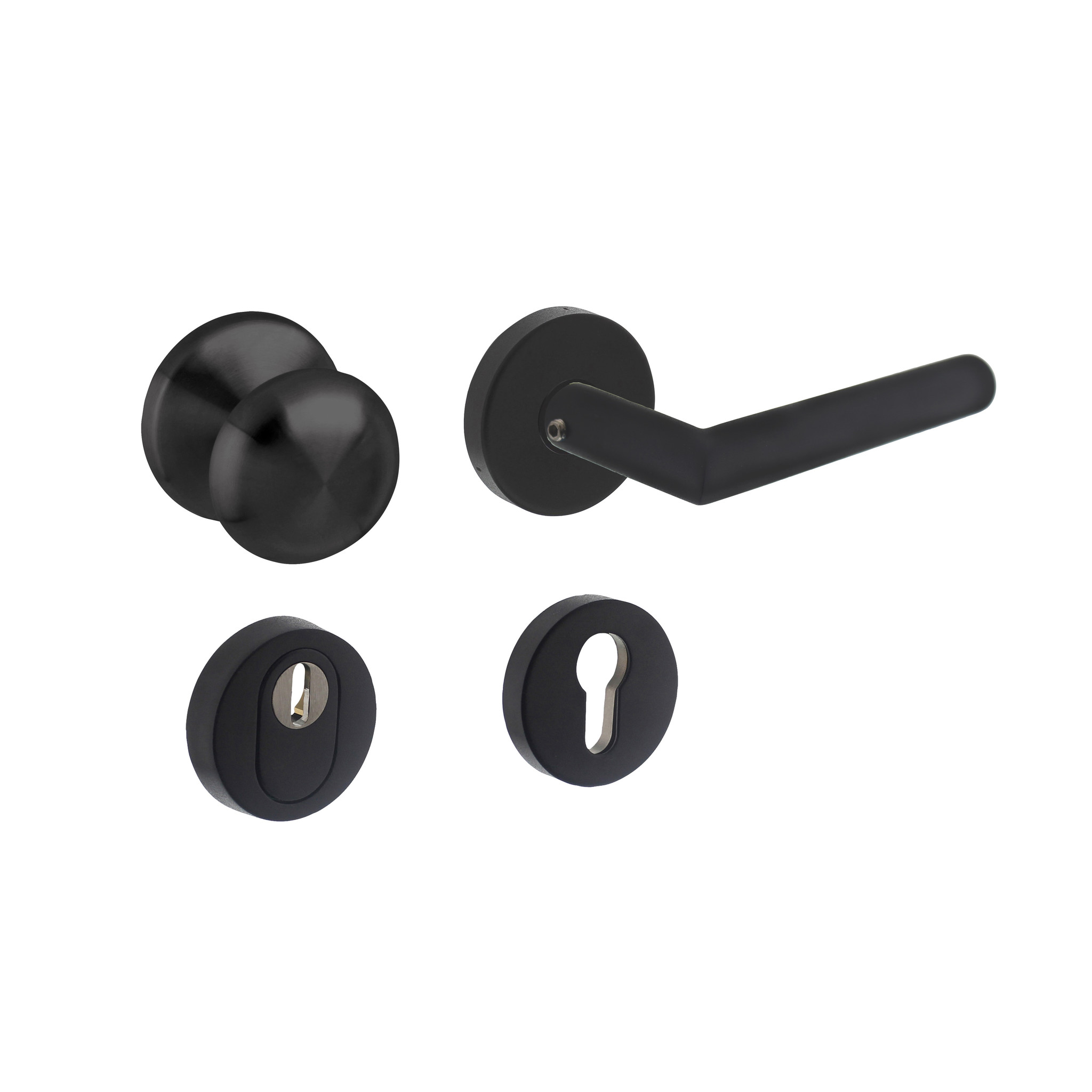 Schwarze Haustürgarnitur in runder Ausführung: doppelt gefederter Türdrücker + fester Knauf + Sicherheitszylinderplatten mit Kernzugschutz.