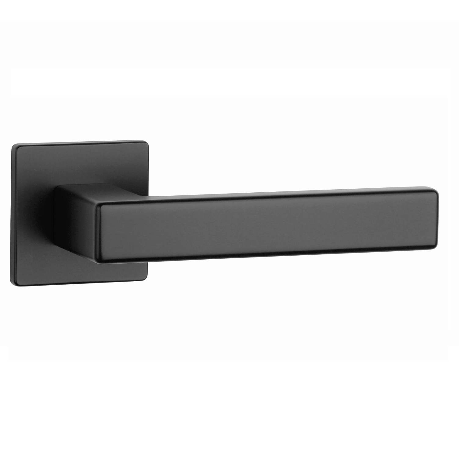Diese massiven schwarzen Türgriffe mit einem schlanken rechteckigen Griff sind auf 52 x 52 mm großen quadratischen Rosetten montiert. Die sehr dünnen Rosetten sind aus einem Stück gefertigt und nur 5 mm dick .