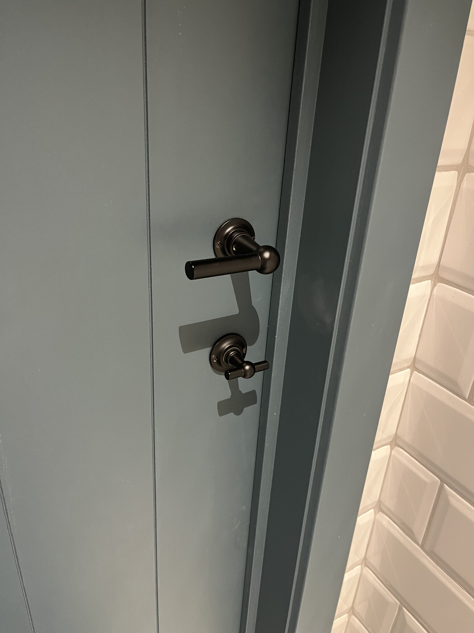 Die schwarzen Türgriffe sitzen auf einer runden Rosette und werden mit einer L+L-Kombination (Form der Griffe) geliefert.