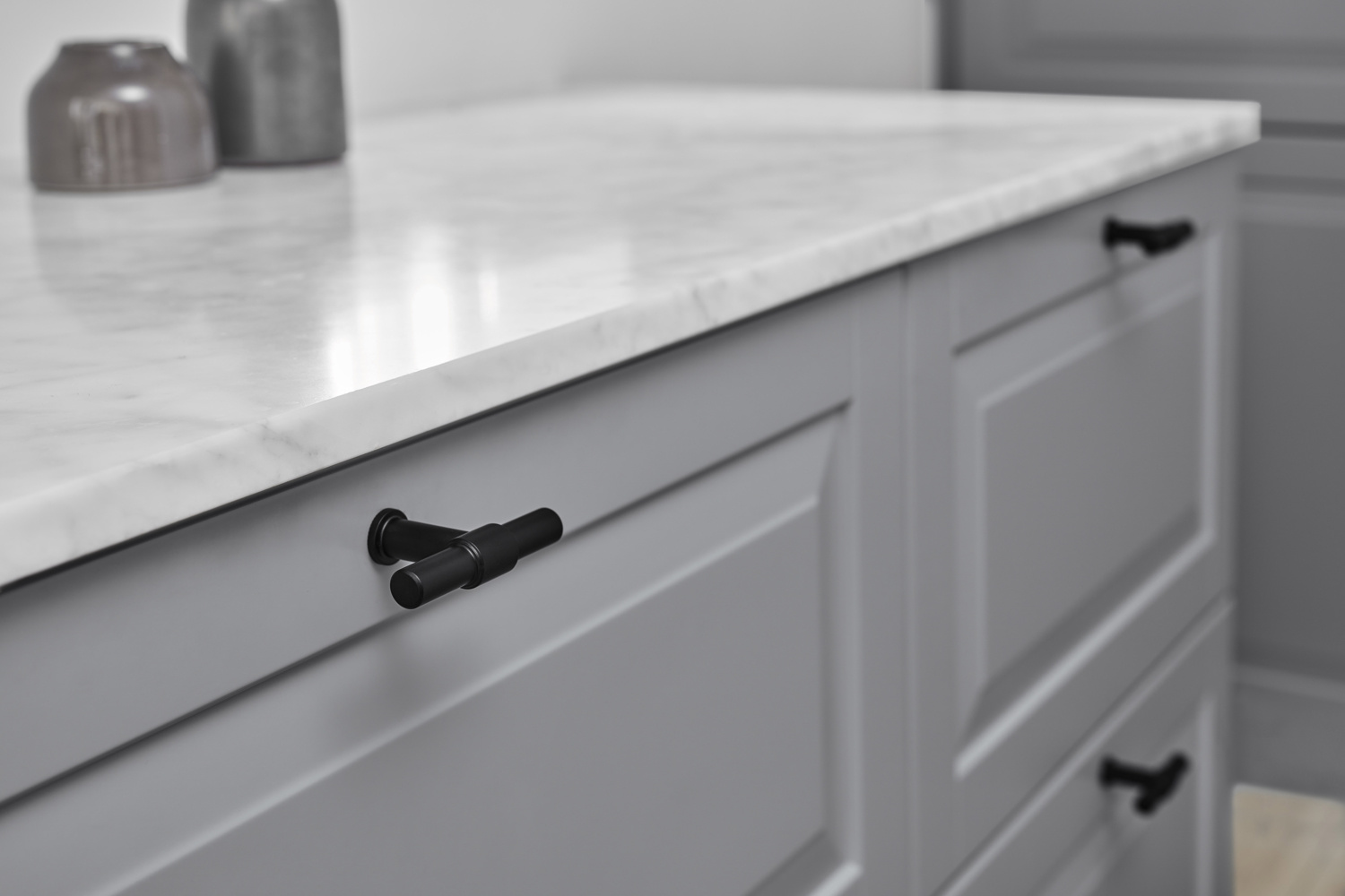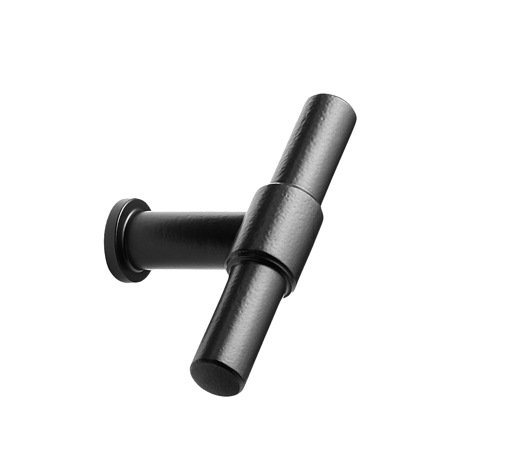 Schwarzer Möbelgriff T-Modell von Furnipart mit einem 75 mm breiten Griff KNOTEN
