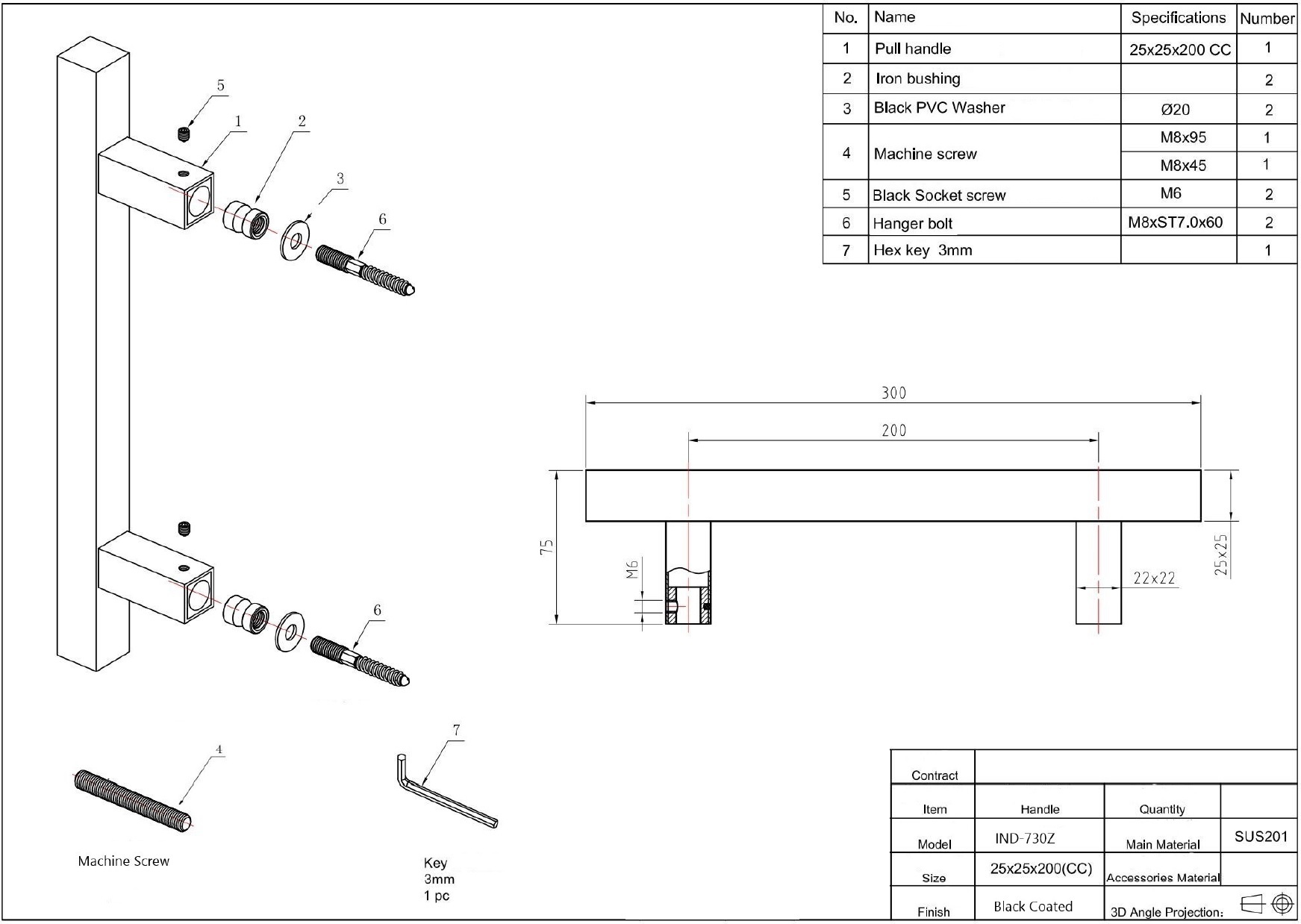 Dieser quadratische schwarze Türgriff (25 x 25 mm) hat eine Achsgröße von 200 mm und eine Gesamtlänge von 300 mm.