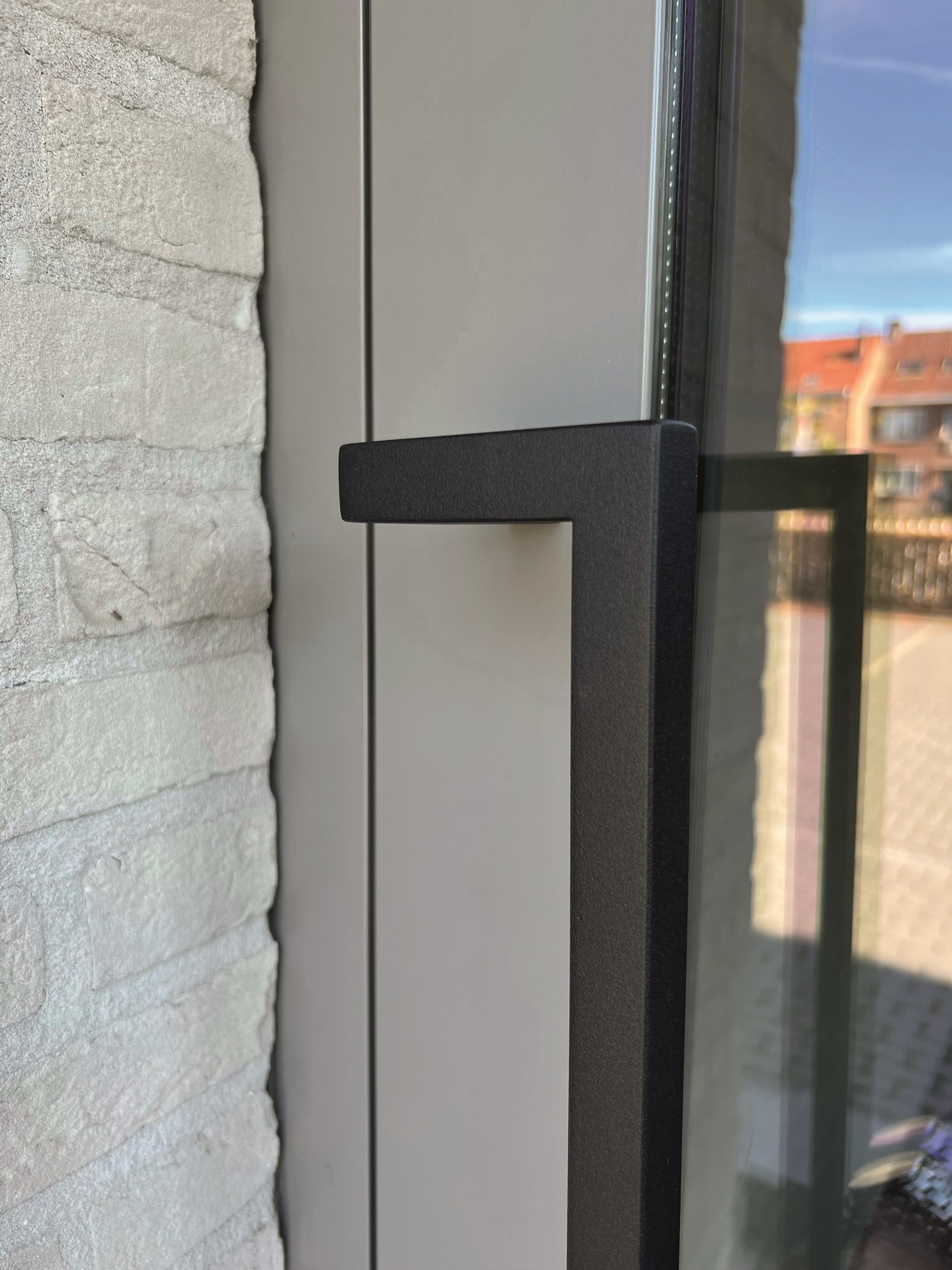 Die quadratischen Türgriffe aus Edelstahl sind mit einer mattschwarzen (RAL9005) Strukturlackierung versehen, die UV-beständig ist, wodurch diese Türgriffe auch für Außentüren geeignet sind.