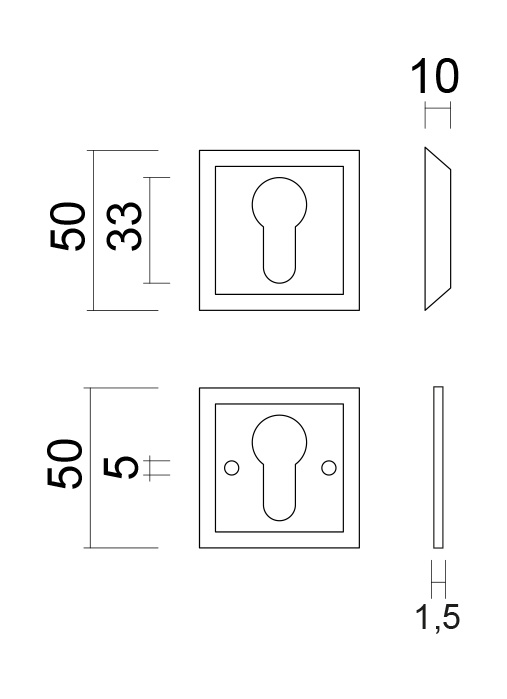 Diese schwarzen Sicherheitszylinderplatten quadratisch 50x50 mm. Die äußere Rosette (A) ist 10 mm dick und die innere Rosette hat eine Dicke von 1,5 mm.