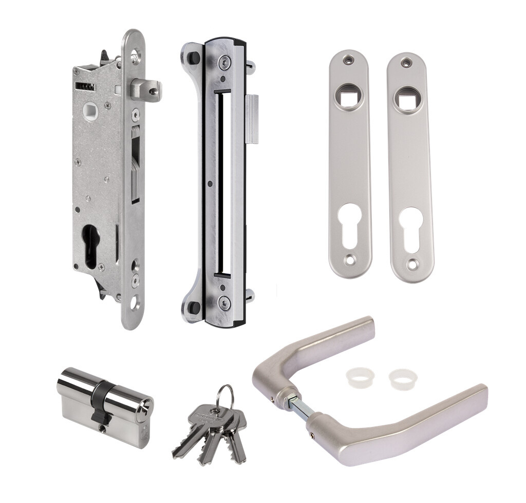 - Komplettset mit Schloss, Schließblech, Abdeckplatten, Türgriffen und Zylinder