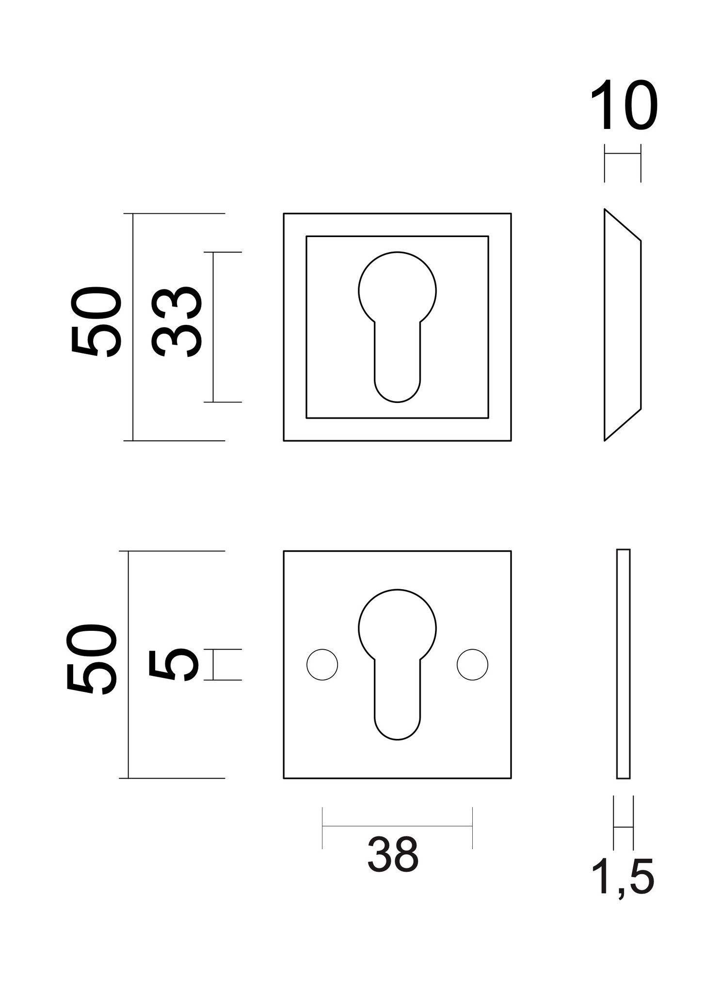 Diese mattgoldenen Sicherheitszylinderplatten sind quadratisch 50x50 mm groß. Die äußere Rosette (A) ist 10 mm dick und die innere Rosette hat eine Dicke von 1,5 mm.