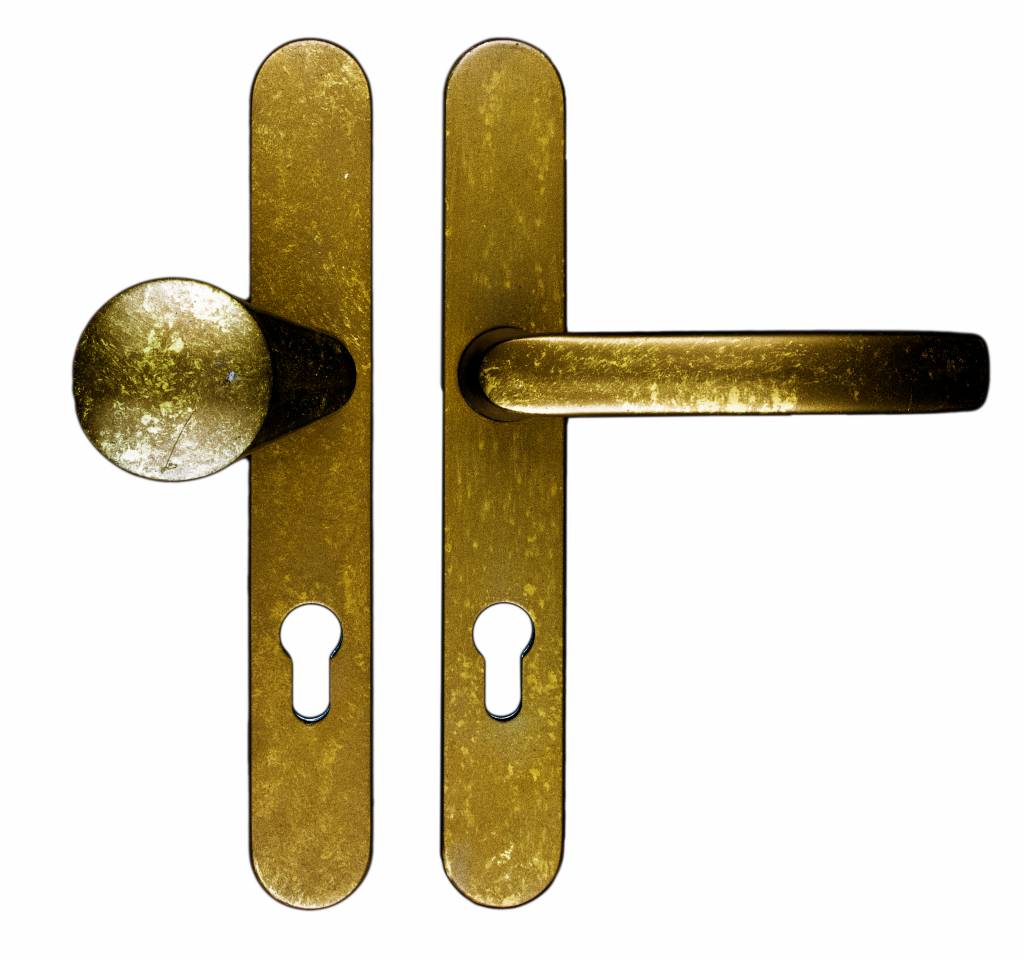 Alter gelber Sicherheitsbeschlag in Türgriff + Knopfausführung mit Achsmaß 72 mm oder 92 mm