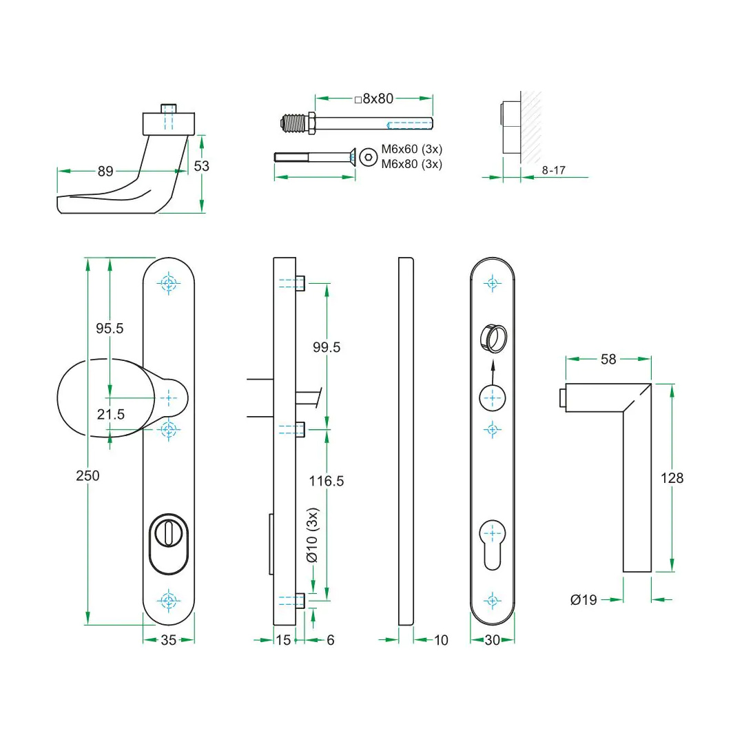 Die verdeckte Schraubbefestigung in der Türplatte sorgt für ein elegantes und modernes Erscheinungsbild ohne sichtbare Befestigungspunkte. Geeignet für Türstärken von 37 bis 57 mm und kompatibel mit Aluminium-, Holz-, PVC- und Stahltüren, ist dieser Türbeschlag vielseitig einsetzbar und eignet sich sowohl für Wohngebäude als auch für Gesundheitseinrichtungen sowie für stark frequentierte Gebäude.