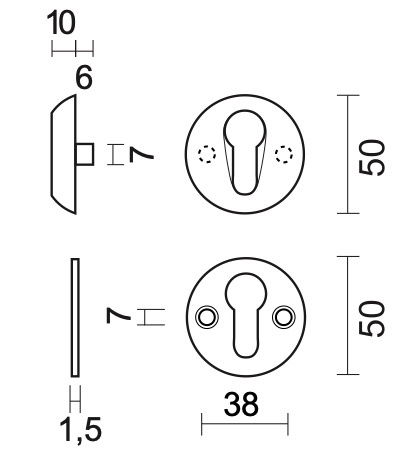 Die rostigen Sicherheitszylinderplatten sind rund 50 mm. Die äußere Rosette (A) ist 10 mm dick und die innere Rosette hat eine Dicke von 1,5 mm.