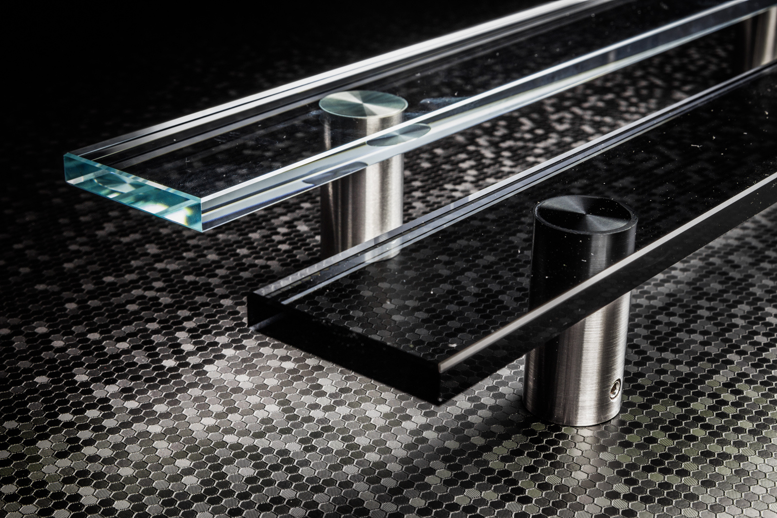 Dieser innovative Türgriff besteht aus Edelstahl kombiniert mit Glas. Die Füße des Türgriffs bestehen aus Edelstahl. Der Türgriff selbst besteht aus klarem, geschliffenem Glas mit einer Dicke von 10 mm, was für eine robuste Optik sorgt.