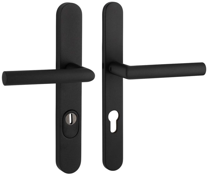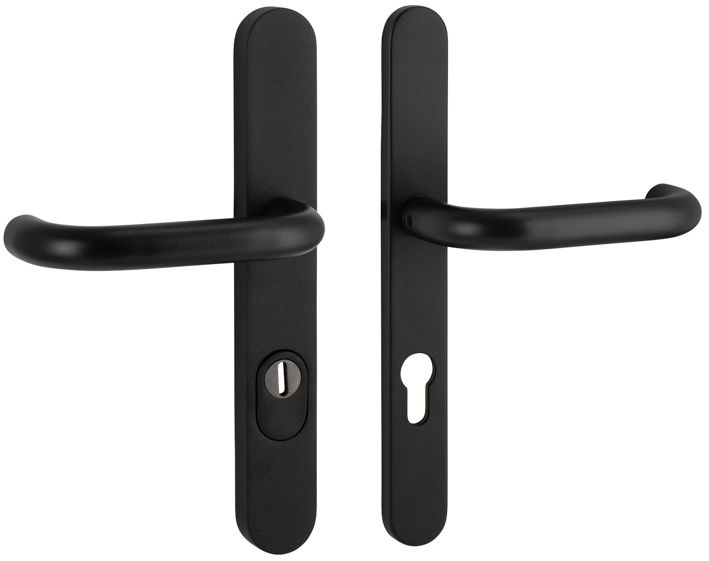 Für höchste Sicherheit an Ihrer Außentür bietet unser Anti-Kernzugbeschlag PRIO aus Edelstahl mit beidseitigem Türdrücker in Schwarz mit feiner Struktur die perfekte Lösung.