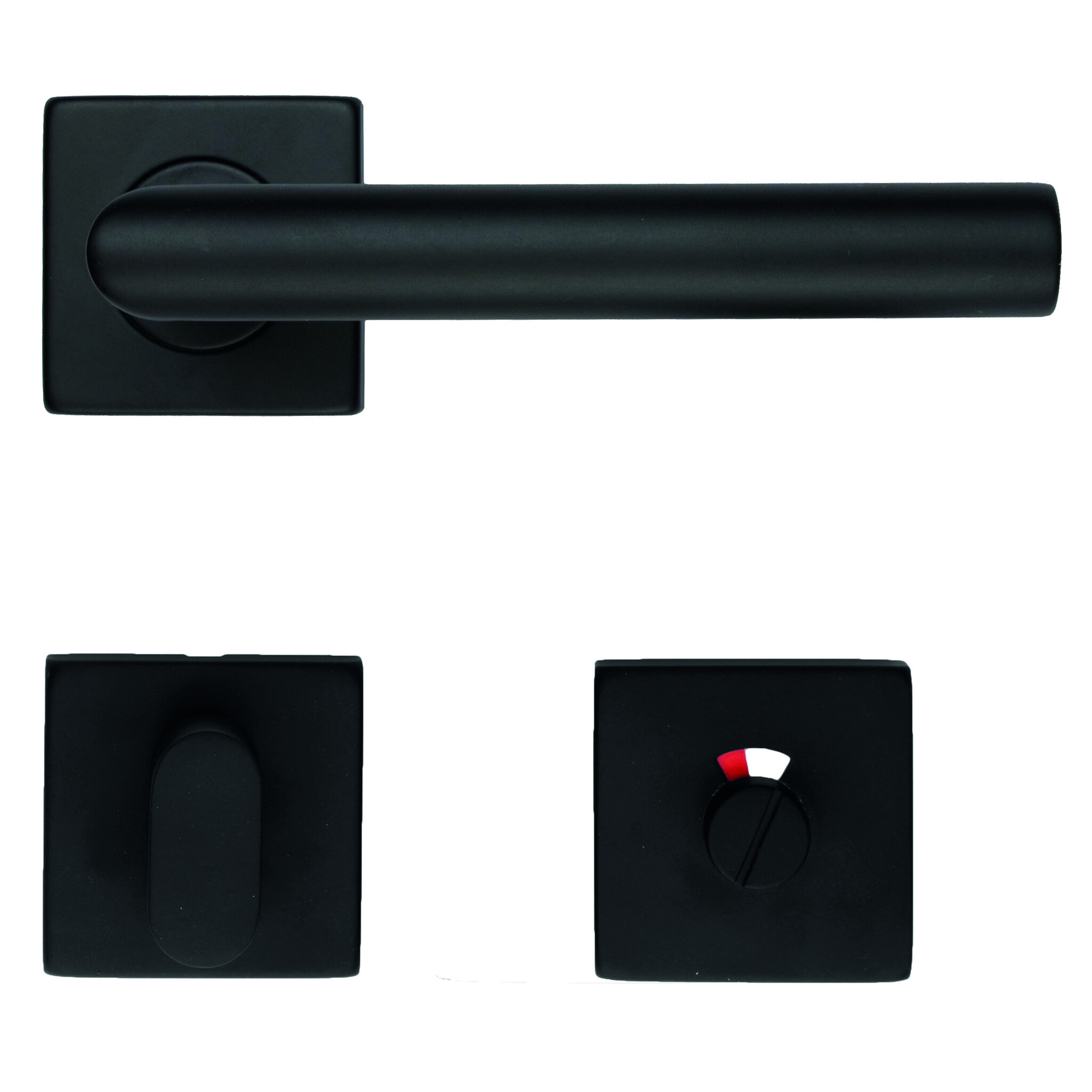 Die schwarzen Türgriffe sitzen auf quadratischen Rosetten. Sie bestehen aus Edelstahl und sind mit einer schwarzen Pulverbeschichtung (RAL 9005) versehen.