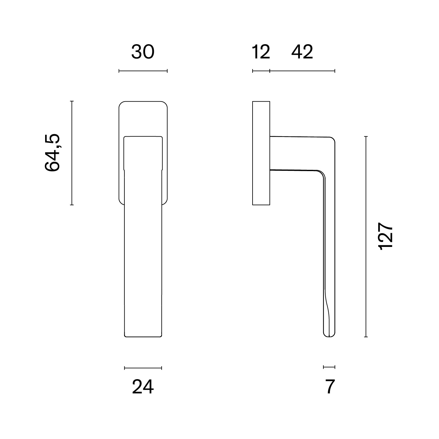 Der 24x7 mm große Griff ist auf einer rechteckigen Rosette von 64,5x30x12 mm montiert.