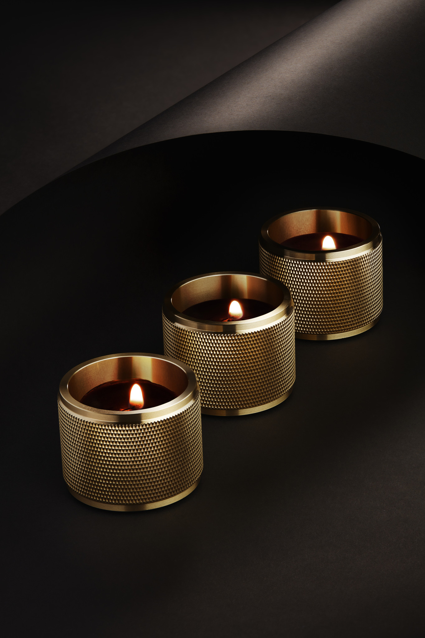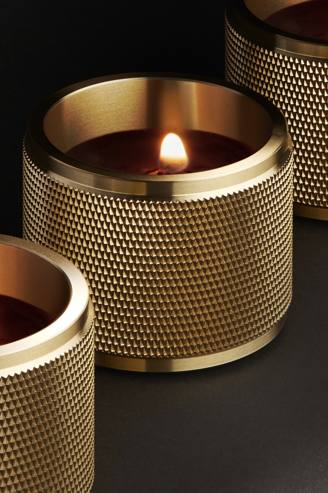 Ein Teelichthalter aus massivem Messing mit Buster+Punchs charakteristischem, diamantgeschliffenem, gekreuztem Muster.