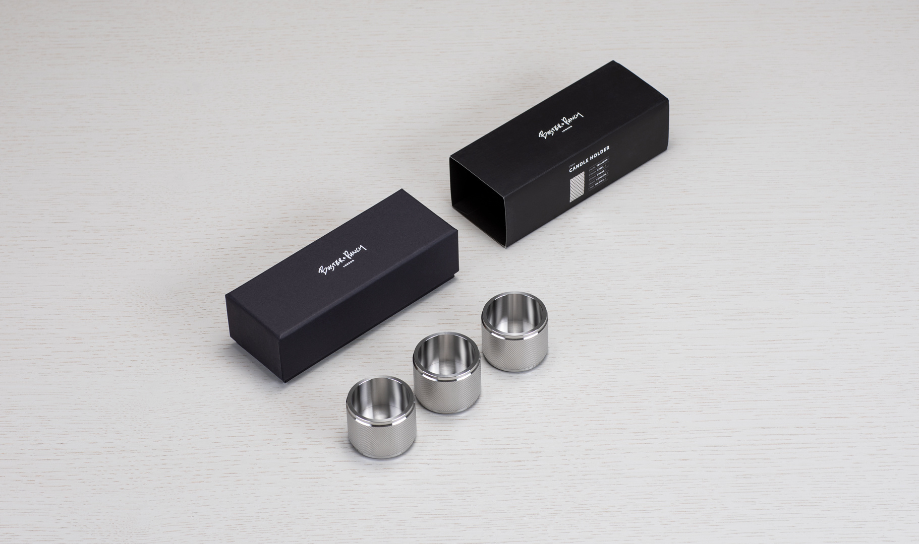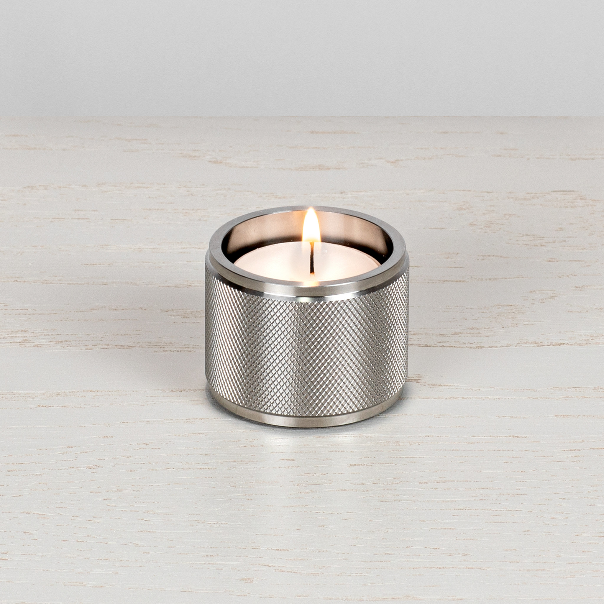 Set aus 3 luxuriösen Teelichthaltern aus massivem Edelstahl und ausgestattet mit dem charakteristischen, diamantgeschliffenen, kreuzförmigen Muster von Buster+Punch.