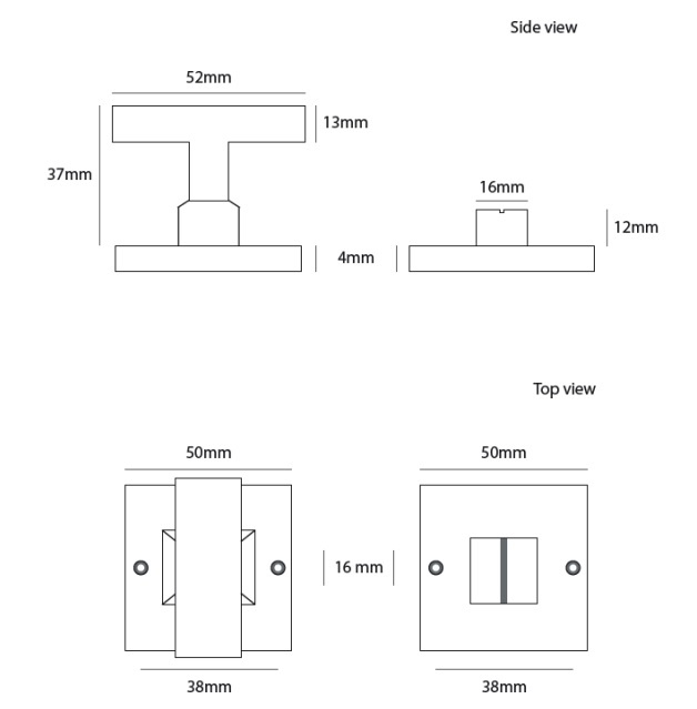Die quadratische Toilettengarnitur von 50 x 50 mm und einer Dicke von 4 mm hat zwei Schraublöcher mit einem Achsabstand von 38 mm.