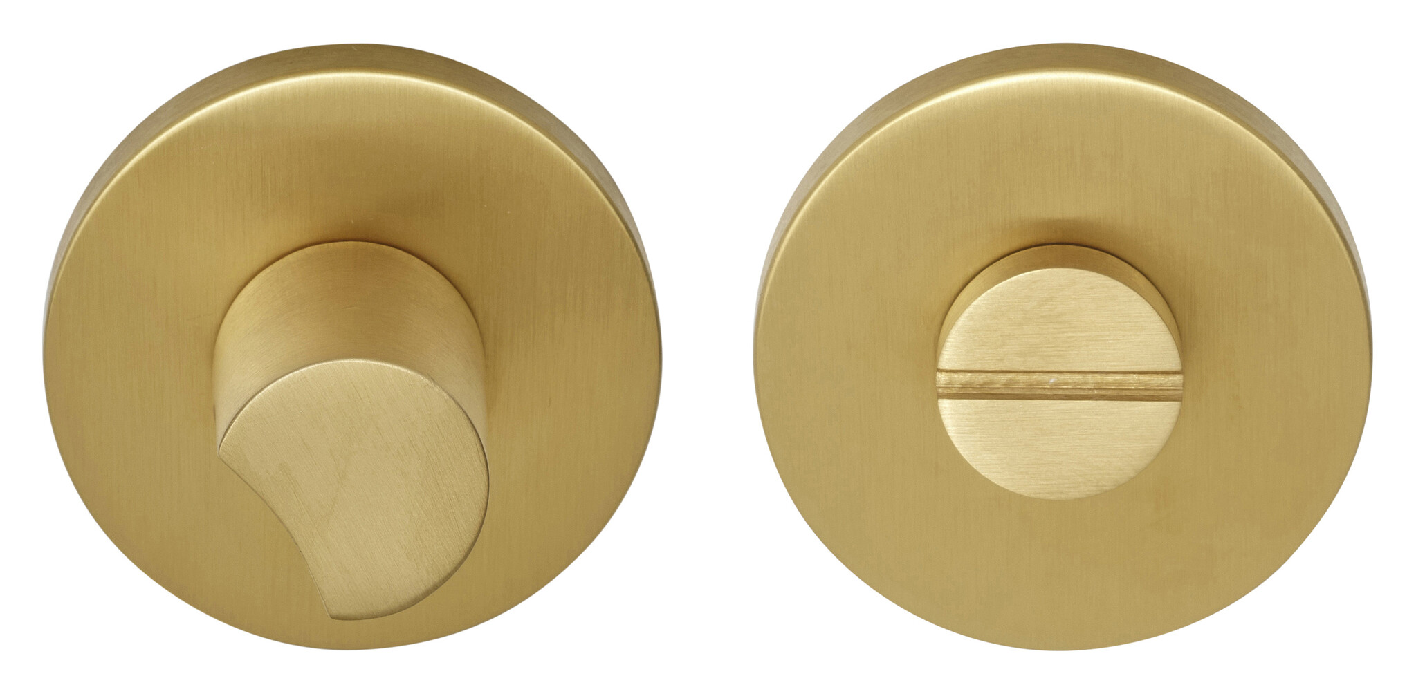 Die Toilettengarnitur aus Edelstahl ist mit einer starken mattgoldenen PVD-Beschichtung versehen. Die Platten haben einen Durchmesser von 53 mm und sind nur 6,5 mm dick.